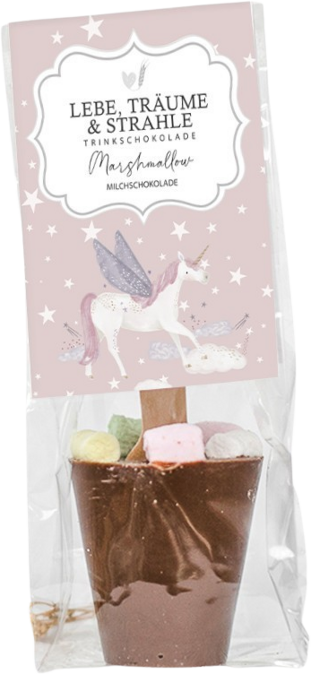 Idealny duet: mleczna czekolada i pianki marshmallows. Ta czekolada do picia wykonana z delikatnej mlecznej czekolady jest ozdobiona małymi, kolorowymi piankami marshmallows i zapewnia wyjątkowo słodkie chwile rozkoszy, kiedy tylko masz na to ochotę. Idealnie nadaje się również na prezent dla najbliższych. Receptura nie zawiera sztucznych aromatów i barwników.