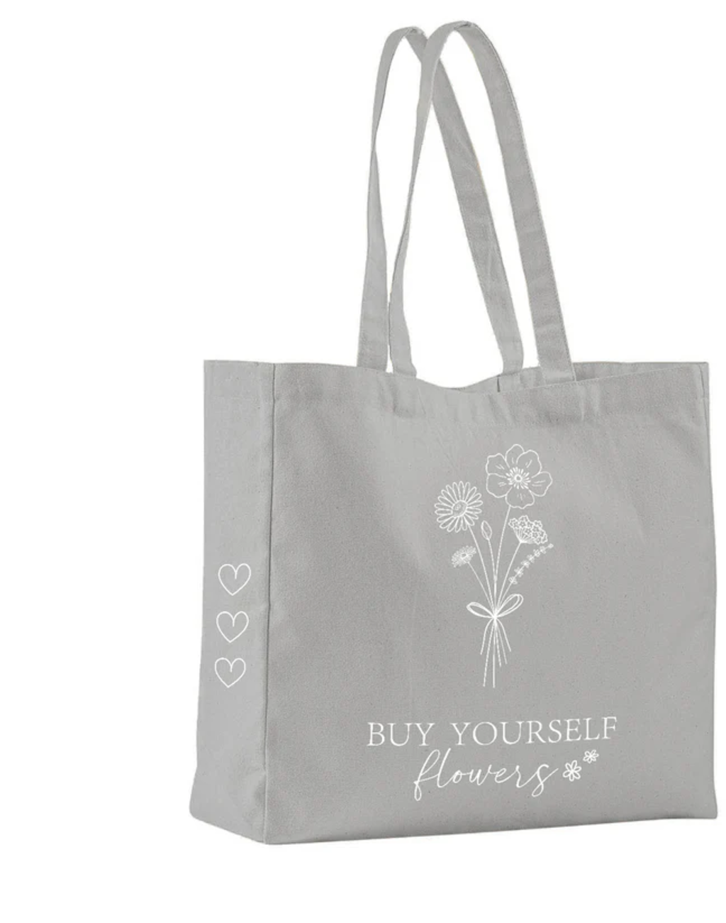 Oszczędź sobie wiązanki kwiatów - ta torba mówi wszystko! Wytrzymała bawełniana torba z długimi uchwytami i nadrukiem "Buy yourself flowers" towarzyszy Ci w codziennym życiu, podczas wizyt na targu lub na małych zakupach.