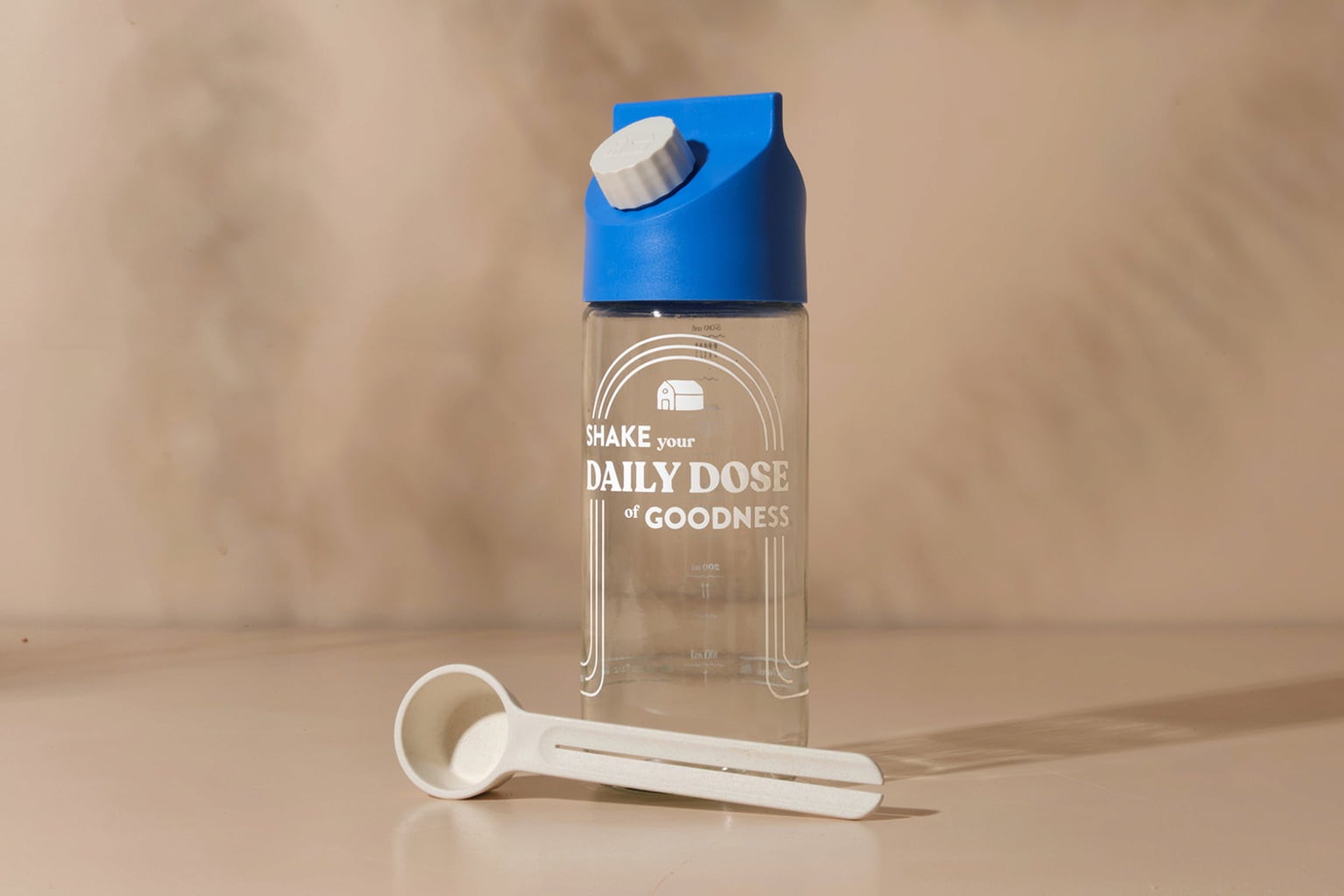 Dzięki tej praktycznej szklanej butelce Blue Farm i dopasowanej łyżeczce dozującej możesz na dobre pożegnać się z ciężkimi kartonami mleka. Przygotuj swój ulubiony napój Blue Farm w proszku świeżo i szybko - w domu lub w podróży.