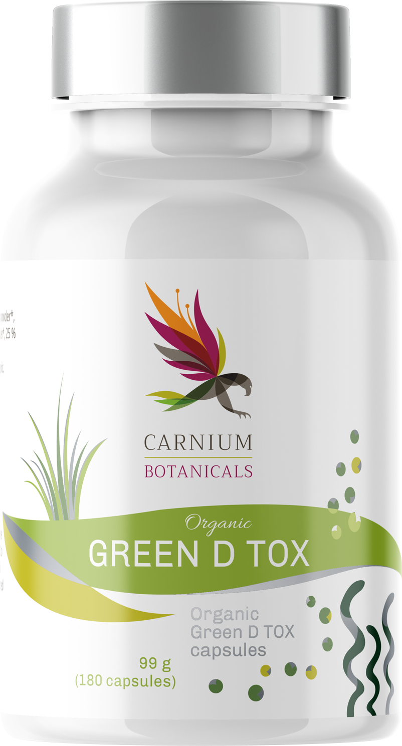 Organiczne kapsułki Green D Tox od Carnium Botanicals zawierają spirulinę, chlorellę, trawę pszeniczną i trawę jęczmienną. Kapsułki są w 100% naturalne, wegańskie i wolne od konserwantów. Idealne do kompleksowego wsparcia w codziennym życiu.