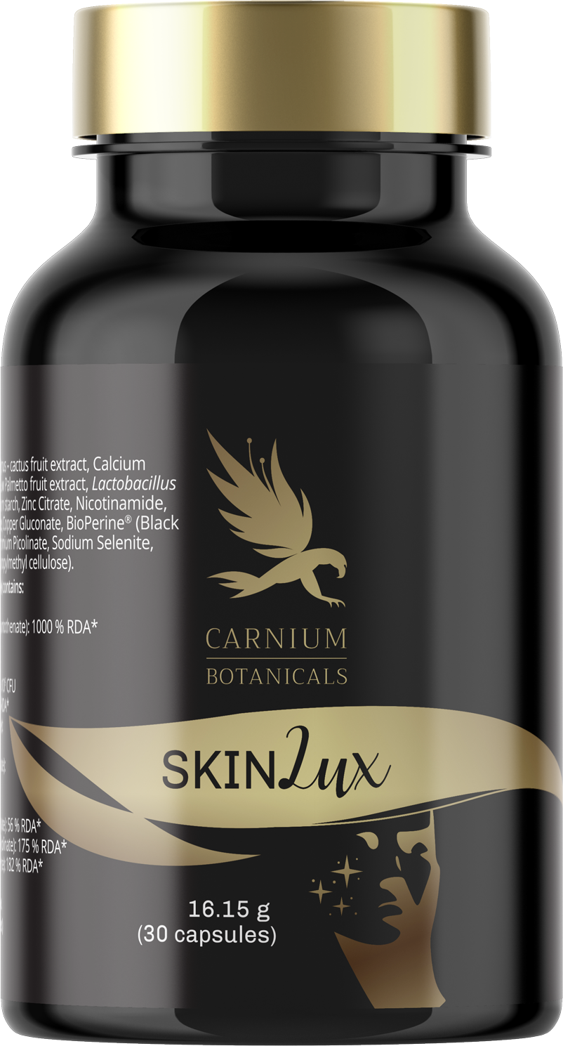 Kapsułki SKIN Lux od Carnium Botanicals są idealne do wspomagania skóry z niedoskonałościami. Wegańska i bezglutenowa formuła zawiera wiele cennych składników, w tym cynk, biotynę i witaminę A.