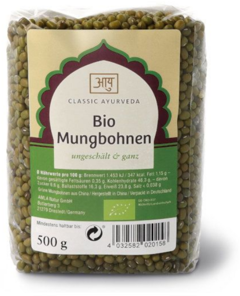 Ta zielona fasola mung charakteryzuje się wszechstronnością w kuchni ajurwedyjskiej. Nieobrane, całe ziarna zachowują swój kształt po ugotowaniu i zapewniają twardą konsystencję do sałatek lub gulaszu. Ze względu na swoją teksturę mogą być również używane do uzyskiwania świeżych kiełków. Produkt pochodzi z kontrolowanych upraw ekologicznych i stanowi bogatą w błonnik podstawę świadomej diety.