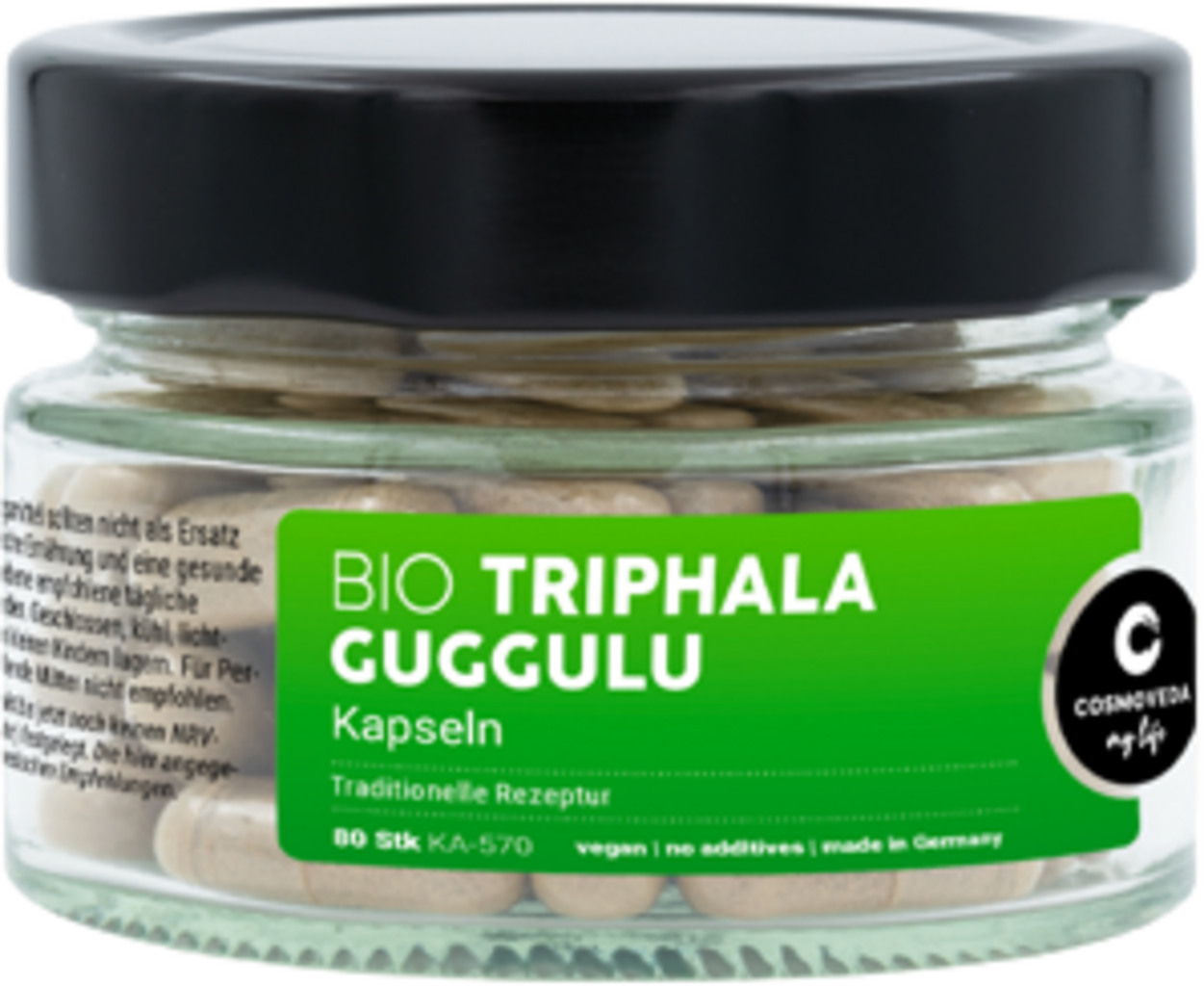 48 % Guggulu (Commiphora mukul)[1], Proszek Amla (Amalaki, Emblica officinalis)[1], Bibhitaki (Terminalia bellirica)[1], Chebulische Myrobalane (Haritaki, Terminalia chebula) Fruchtpulver[1], pieprz długi (Pippali, Piper longum)[1], hydroksypropylometyloceluloza[2]