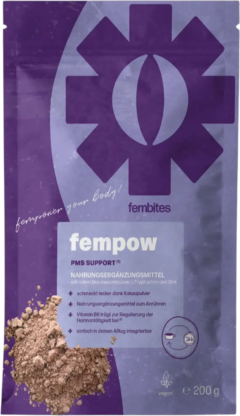 Proszek fempow® PMS SUPPORT od fembites zapewnia optymalne wsparcie w drugiej połowie cyklu. Wegańska formuła nie zawiera sztucznych dodatków i hormonów. Zamiast tego proszek jest wzbogacony proszkiem maca i proszkiem z dzikiej róży. Formuła została uzupełniona między innymi o witaminę B12, cynk i L-tryptofan. Przyjemny kakaowy smak sprawia, że codzienne przyjmowanie preparatu jest przyjemnym doświadczeniem.