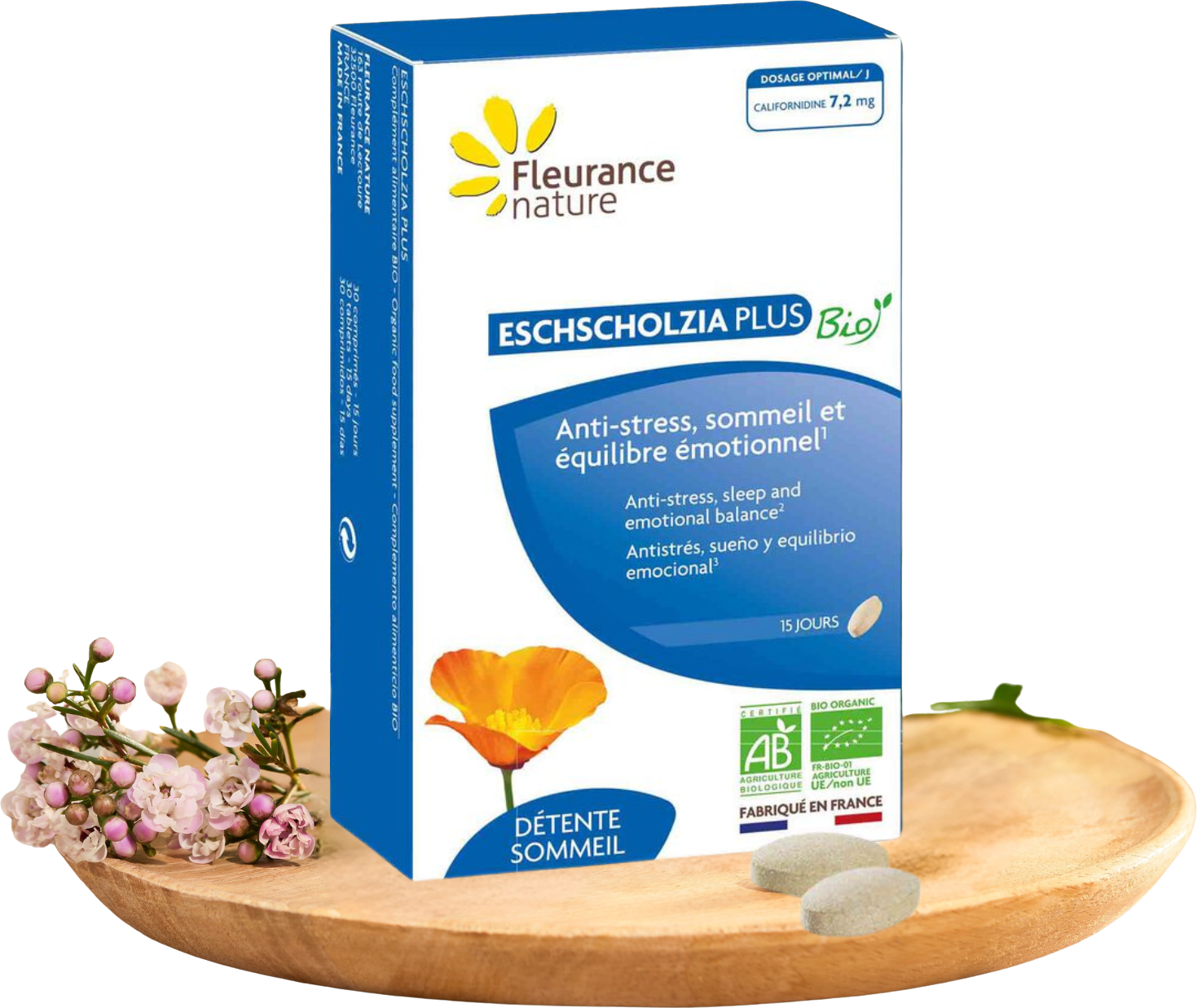 Eszolcja jest również znana jako mak kalifornijski lub mak złoty. Ten produkt zawiera roślinę uprawianą ekologicznie we francuskim departamencie Loir-et-Cher.