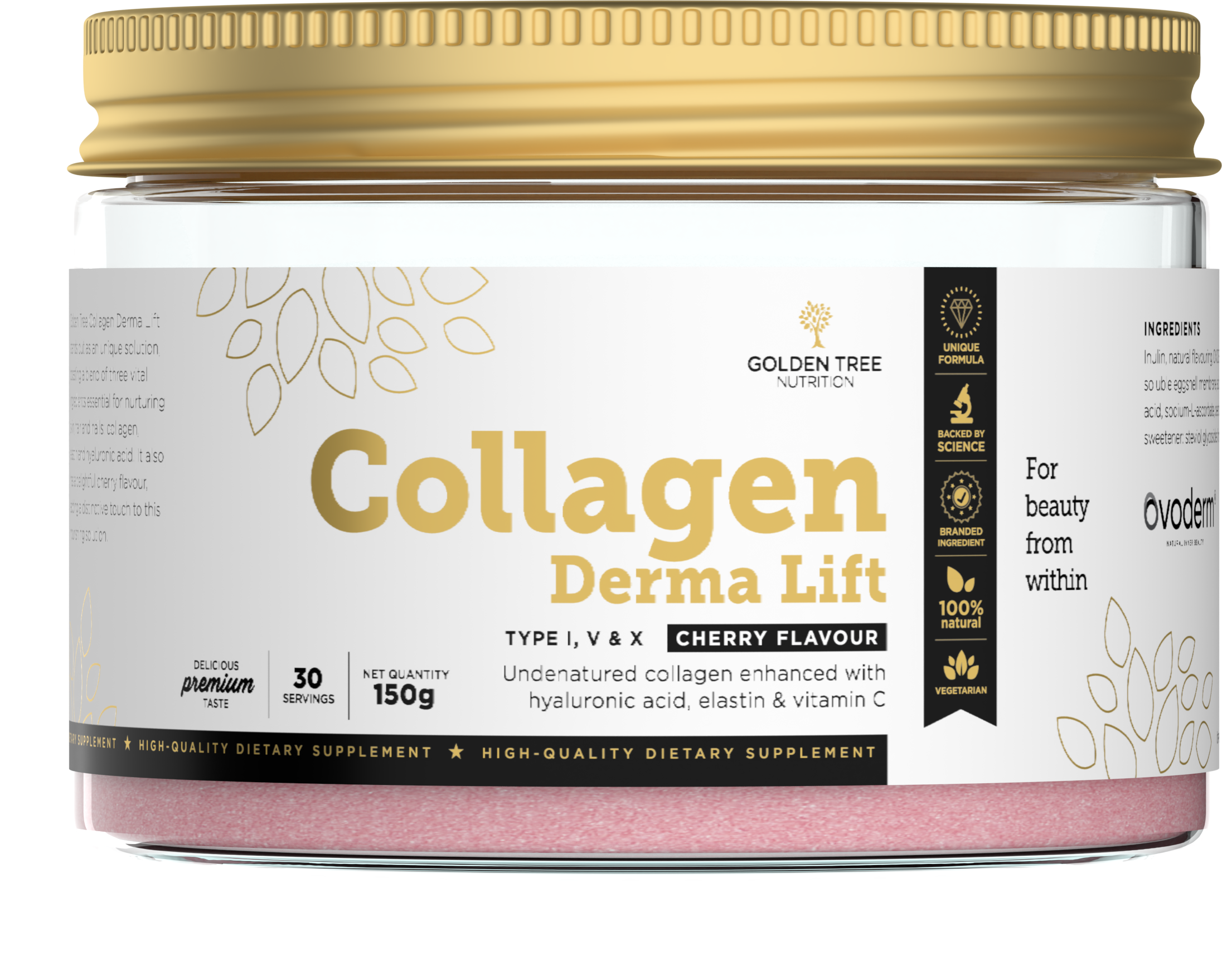 Jako podstawowe białko, kolagen nadaje naszym tkankom strukturę i zapewnia jędrność. Collagen Derma Lift od Golden Tree zawiera kolagen typu I, V i X. Ponadto preparat zawiera kwas hialuronowy, elastynę i witaminę C, które przyczyniają się do prawidłowego tworzenia kolagenu dla prawidłowego funkcjonowania skóry. Proszek o pysznym wiśniowym smaku nadaje się również do diety wegetariańskiej.