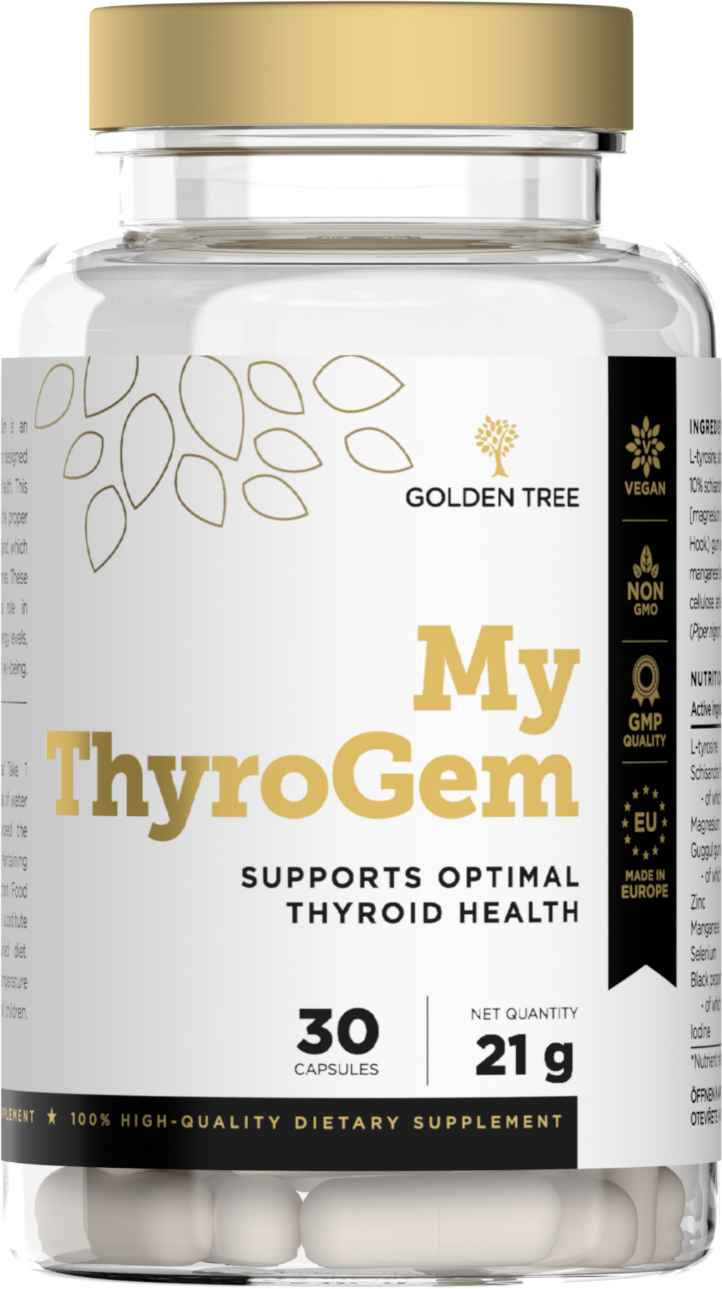 Tarczyca jest organem niezbędnym dla naszego metabolizmu i ogólnego samopoczucia. My ThyroGem firmy Golden Tree to naturalne kapsułki zawierające jod i selen, które wspomagają prawidłowe funkcjonowanie tarczycy.