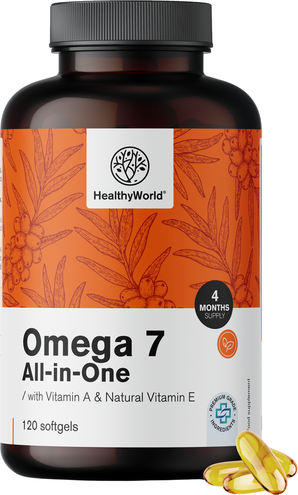 Omega-7 All-in-One zawiera kombinację kwasów tłuszczowych Omega-3, -6, -7 i -9. Wszystkie te kwasy są nienasyconymi kwasami tłuszczowymi. Miękkie kapsułki są wzbogacone olejem z rokitnika. Pochodzi on z rośliny o tej samej nazwie i od wieków znany jest ze swoich wszechstronnych właściwości. Kapsułki są oparte wyłącznie na roślinach i są łatwe do przyjmowania.