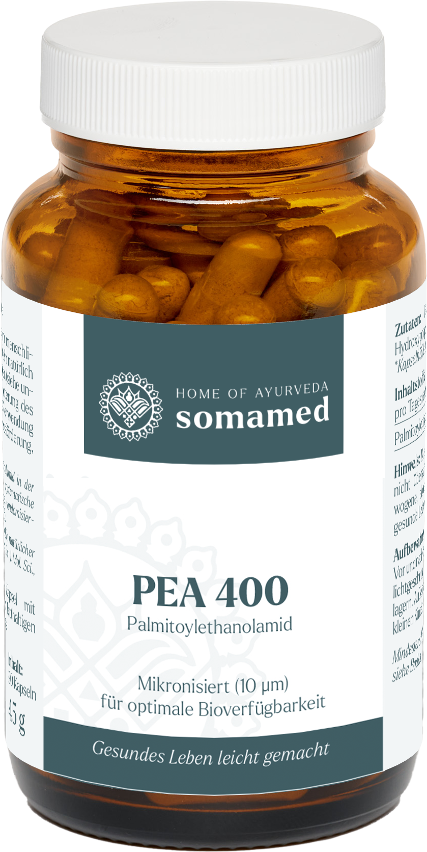 PEA 400 od Home of Ayurveda somamed zawiera palmitoiloetanoloamid (PEA) w nowej, zmikronizowanej formule. Szczególnie drobny rozmiar cząstek (95% < 10 µm) poprawia rozpuszczanie w przewodzie pokarmowym. Mikronizowane formy PEA są uważane w literaturze specjalistycznej za wariant zoptymalizowany technologicznie.