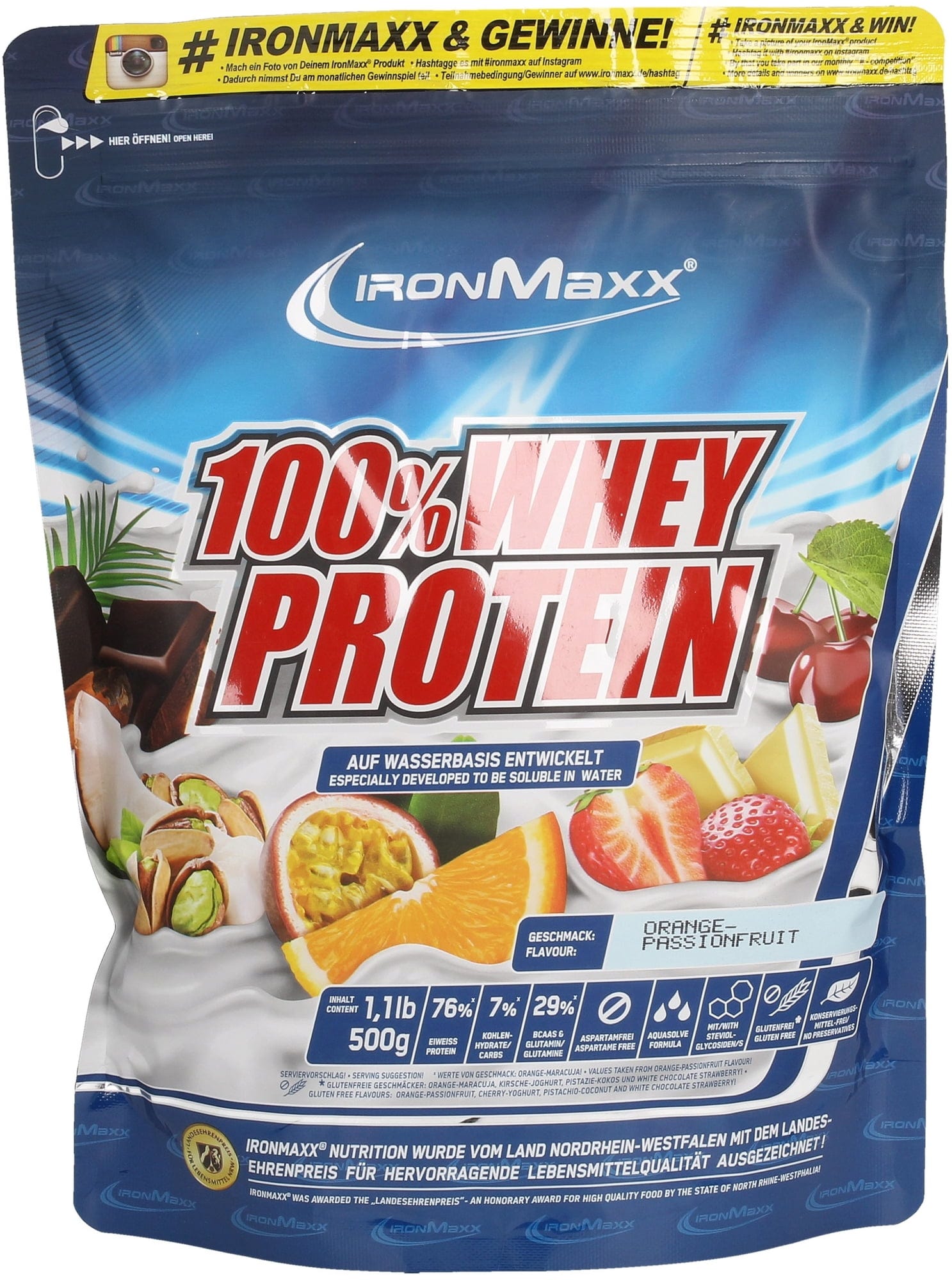 ironMaxx 100% Whey Protein 500 g opakowanie, Pomarańcza-marakuja (500 g)