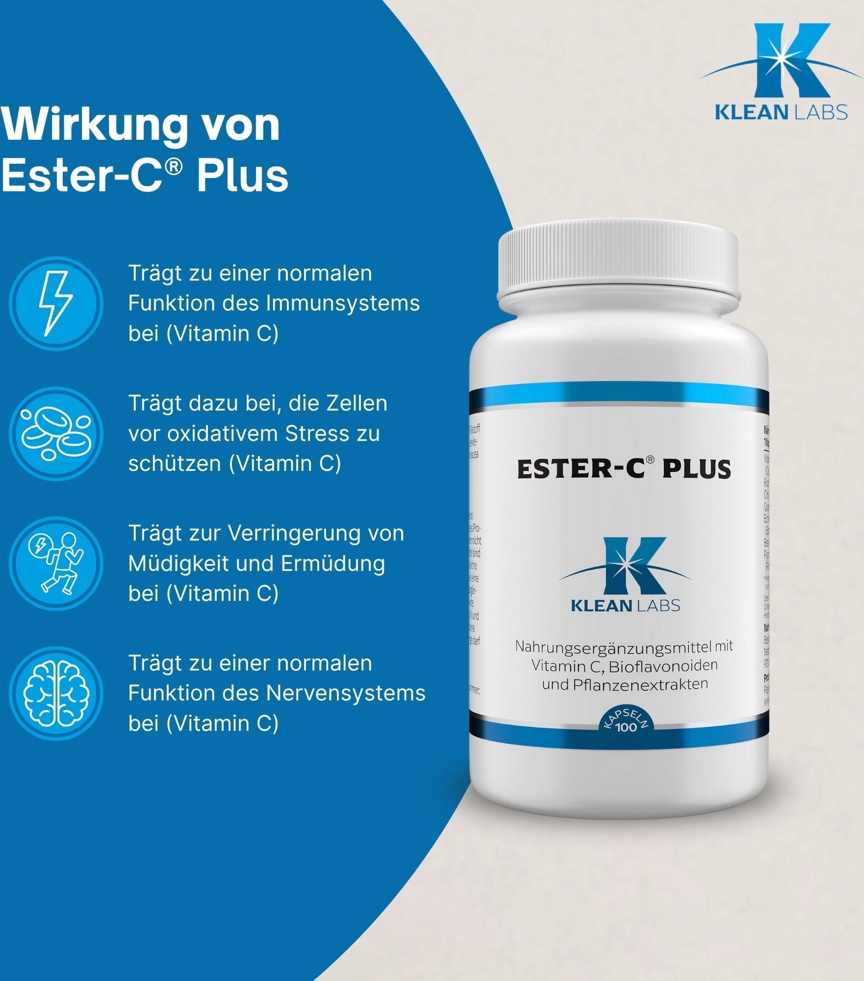 Ester-C® Plus firmy KLEAN LABS zawiera bezkwasową witaminę C, która jest uzyskiwana w opatentowanym procesie produkcyjnym i ma właściwości przedłużonego uwalniania, zapewniające długotrwałe dostarczanie do 24 godzin. Dodatkowo kapsułki zawierają kwercetynę, ekstrakt z korzenia echinacei, beta-karoten oraz ekstrakt z kory sosny morskiej.
