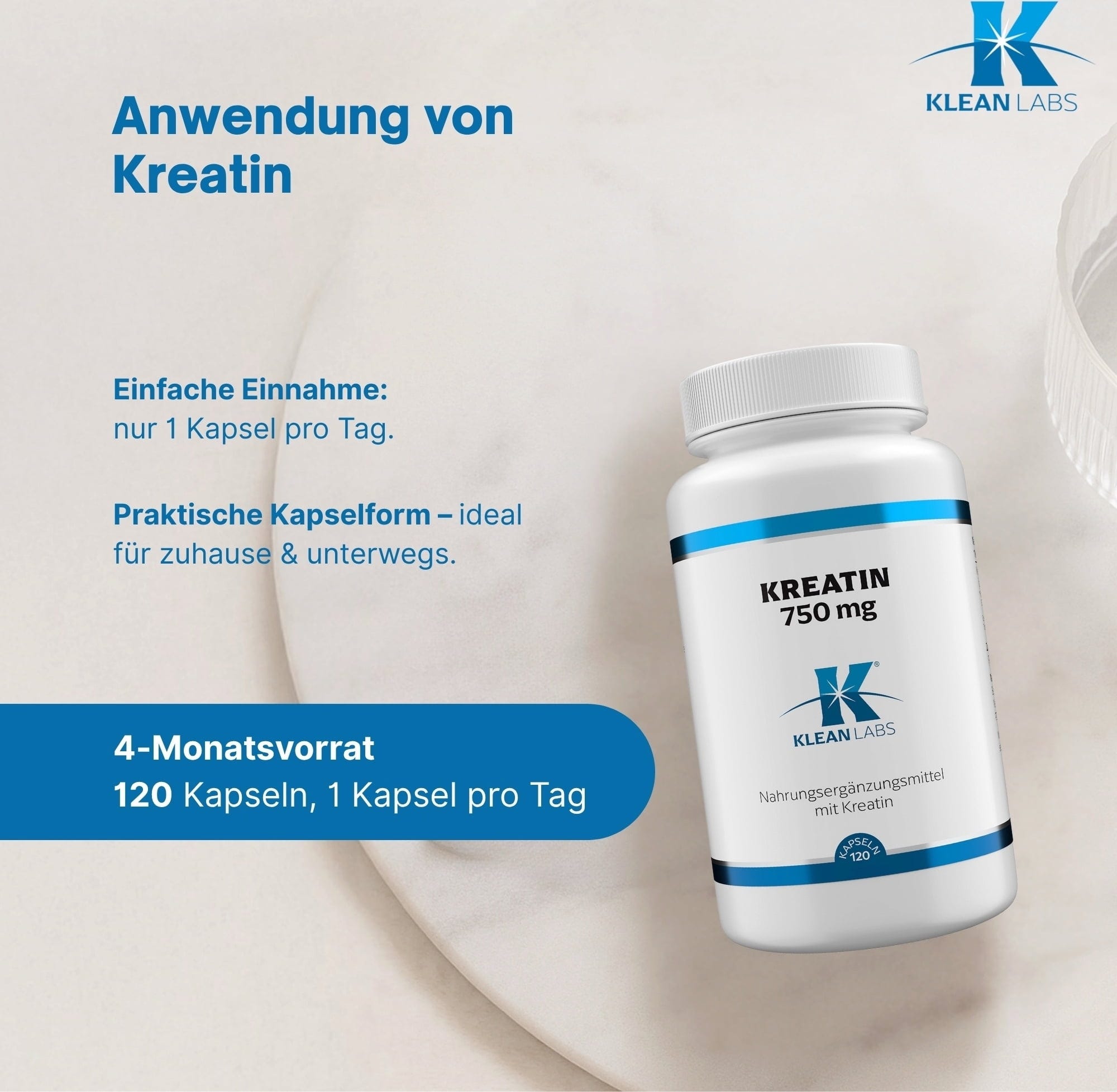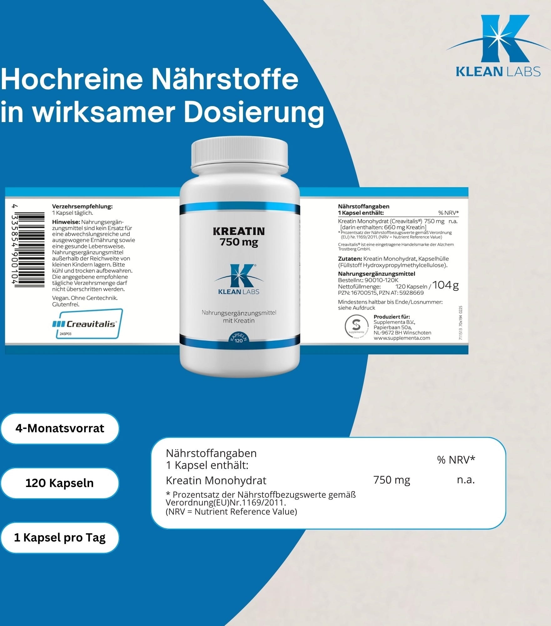 KLEAN LABS Kapsułki kreatyny Creavitalis®, 120 kapsułek