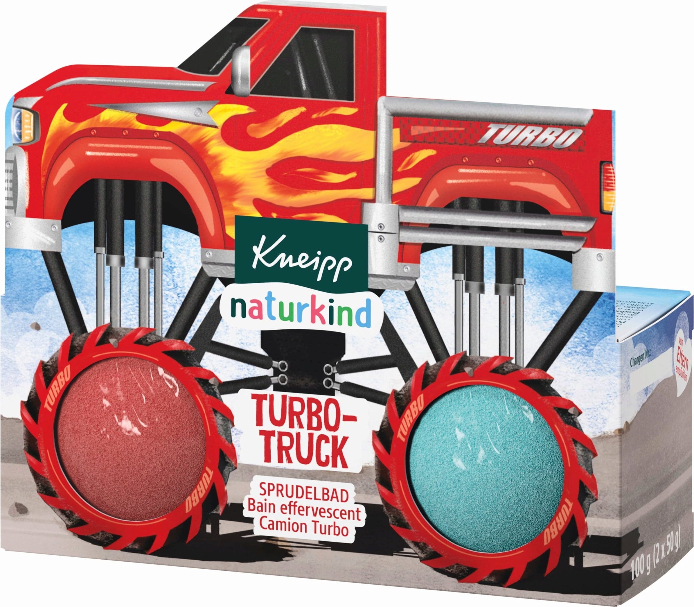 Kąpiel z bąbelkami Kneipp naturkind Turbo-Truck zapewnia pełną akcji zabawę w wannie i sprawia, że oczy dzieci się świecą. Po zanurzeniu w ciepłej wodzie kule do kąpieli zaczynają bąbelkować, zabarwiają wodę na czerwono lub niebiesko i wydzielają owocowy zapach czarnej porzeczki. Awokado i olej z pestek winogron odżywiają delikatną skórę dzieci i zapobiegają jej wysuszeniu. Kąpiel z bąbelkami została opracowana specjalnie dla dzieci w wieku od 3 lat.