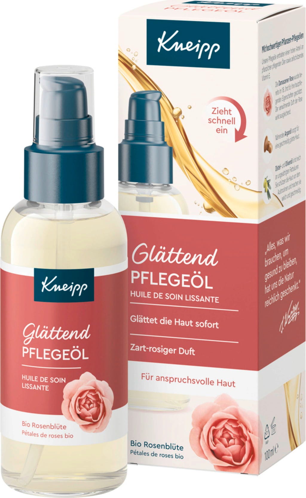 Ten wygładzający olejek pielęgnacyjny od Kneipp rozpieszcza kwiatowym, delikatnie różanym zapachem i wysokiej jakości mieszanką olejków z krokosza barwierskiego, arganu i oliwy z oliwek, która pozostawia skórę elastyczną. Formuła pomaga wymagającej skórze czuć się gładko i równomiernie. Można go stosować na wiele sposobów do twarzy, ciała i włosów, aby wzbogacić codzienny program pielęgnacji skóry.
