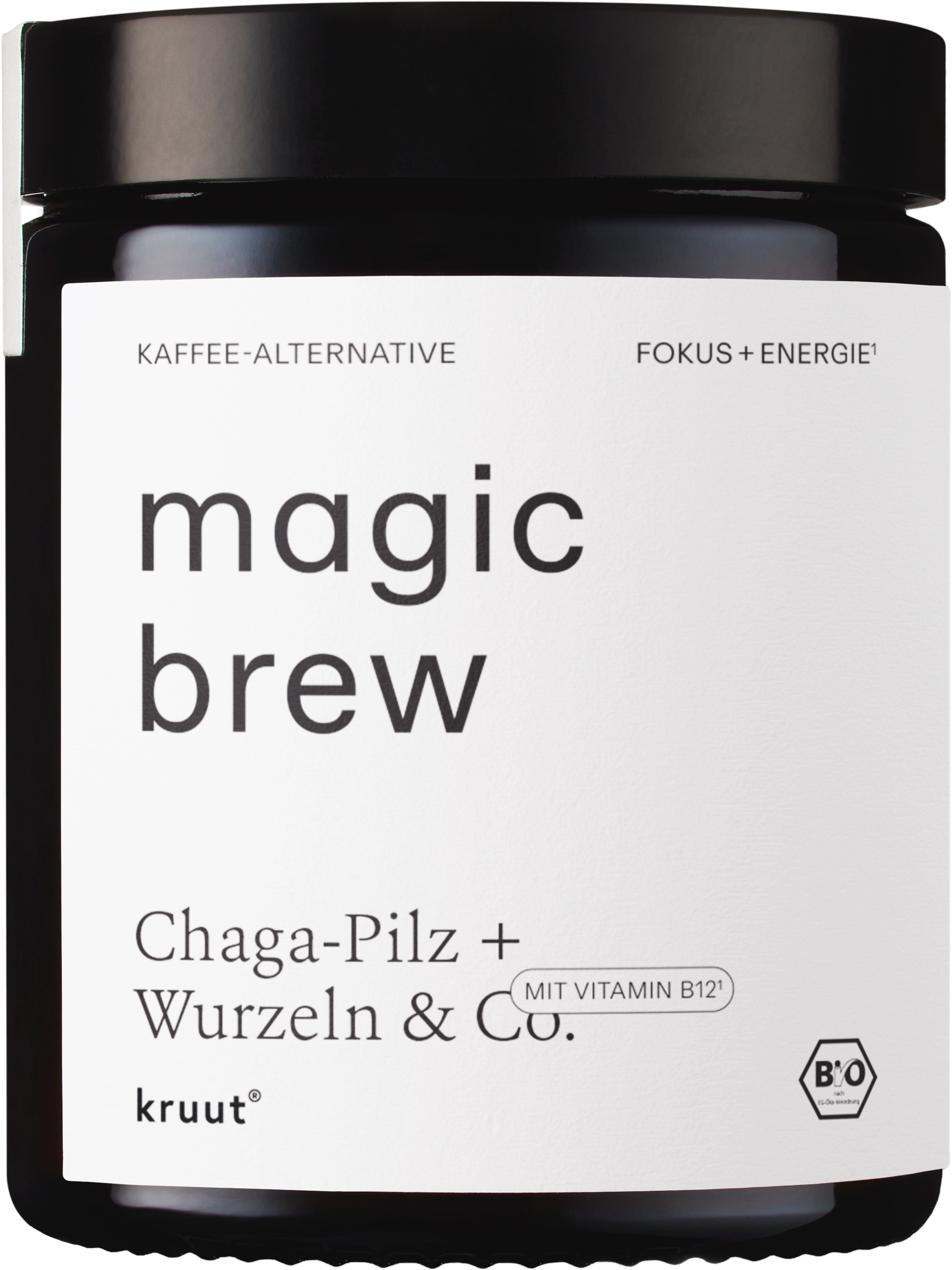 Proszek Magic Brew firmy kruut to bezkofeinowa alternatywa dla tradycyjnej kawy. Zamiast kofeiny, proszek zawiera grzyby chaga, ekstrakt z shiitake, korzeń cykorii i korzeń mniszka lekarskiego. Grzyby i korzenie są zbierane ręcznie i delikatnie suszone w temperaturze poniżej 40 stopni natychmiast po zebraniu, aby nie stracić cennych substancji roślinnych. Po wysuszeniu są delikatnie mielone, a nie sproszkowane, aby zachować jak najwięcej składników odżywczych.