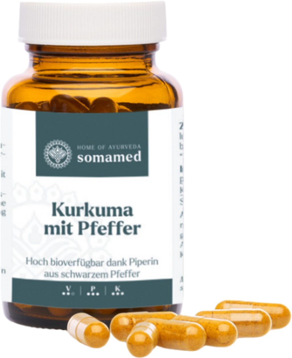 Kurkuma, znana również jako kurkumina, pochodzi z Azji Południowej i już dawno zadomowiła się w kuchni europejskiej. Ten żółty korzeń jest również wykorzystywany w segmencie suplementów diety. Home of Ayurveda somamed łączy najlepszą kurkumę w proszku z czarnym pieprzem w swoich kapsułkach ziołowych. Ta kombinacja jest stosowana w Ajurwedzie w celu zrównoważenia dosh Vata, Pitta i Kapha.