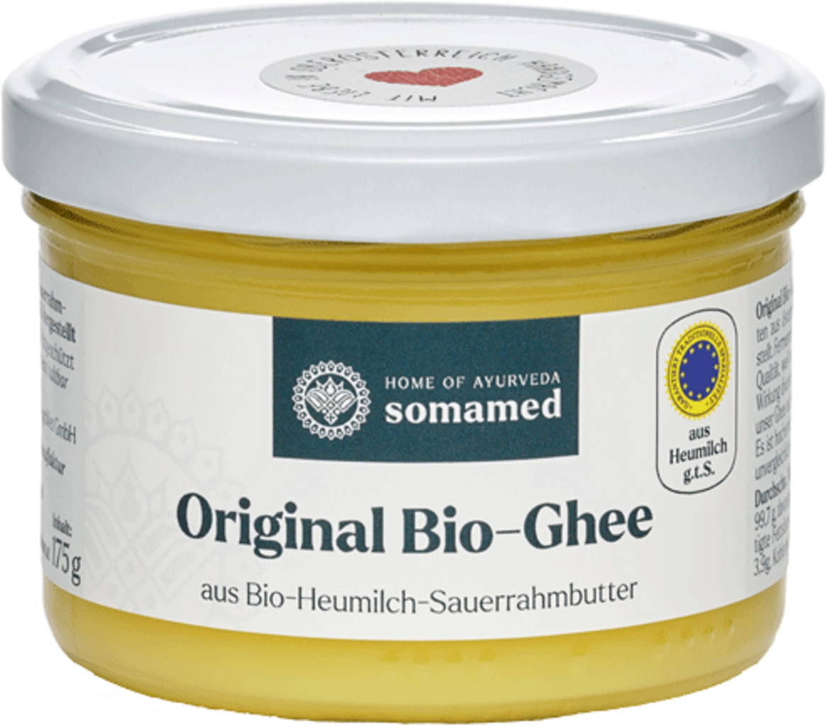 Oryginalne ajurwedyjskie ghee, jest wytwarzane ręcznie w Górnej Austrii z nieskazitelnego, organicznego austriackiego masła z kwaśnej śmietany. Cała produkcja jest bardzo złożona i czasochłonna. Gwarantuje to długi okres przydatności do spożycia, a także przyczynia się do niezwykle wysokiej jakości produktu. Witaminy A, D, E i K zostają zachowane, a smak nasila się z każdą sekundą. Złoto-żółty kolor jest również wyznacznikiem nienagannej jakości. Ghee ma szczególnie długą tradycję w Ajurwedzie i jest nadal używane codziennie. Niezależnie od tego, czy w kuchni, podczas kuracji Rasayana, czy jako składnik do celów leczniczych. Produkt jest szczególnie popularny w kuchni. Ghee nie utlenia się po podgrzaniu.