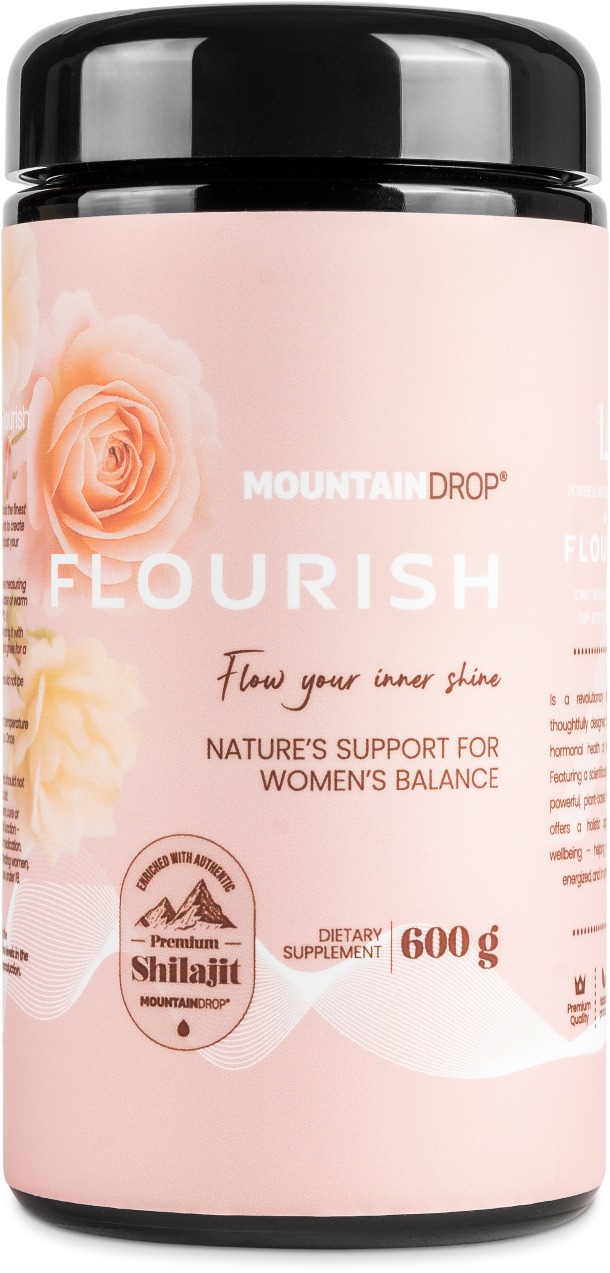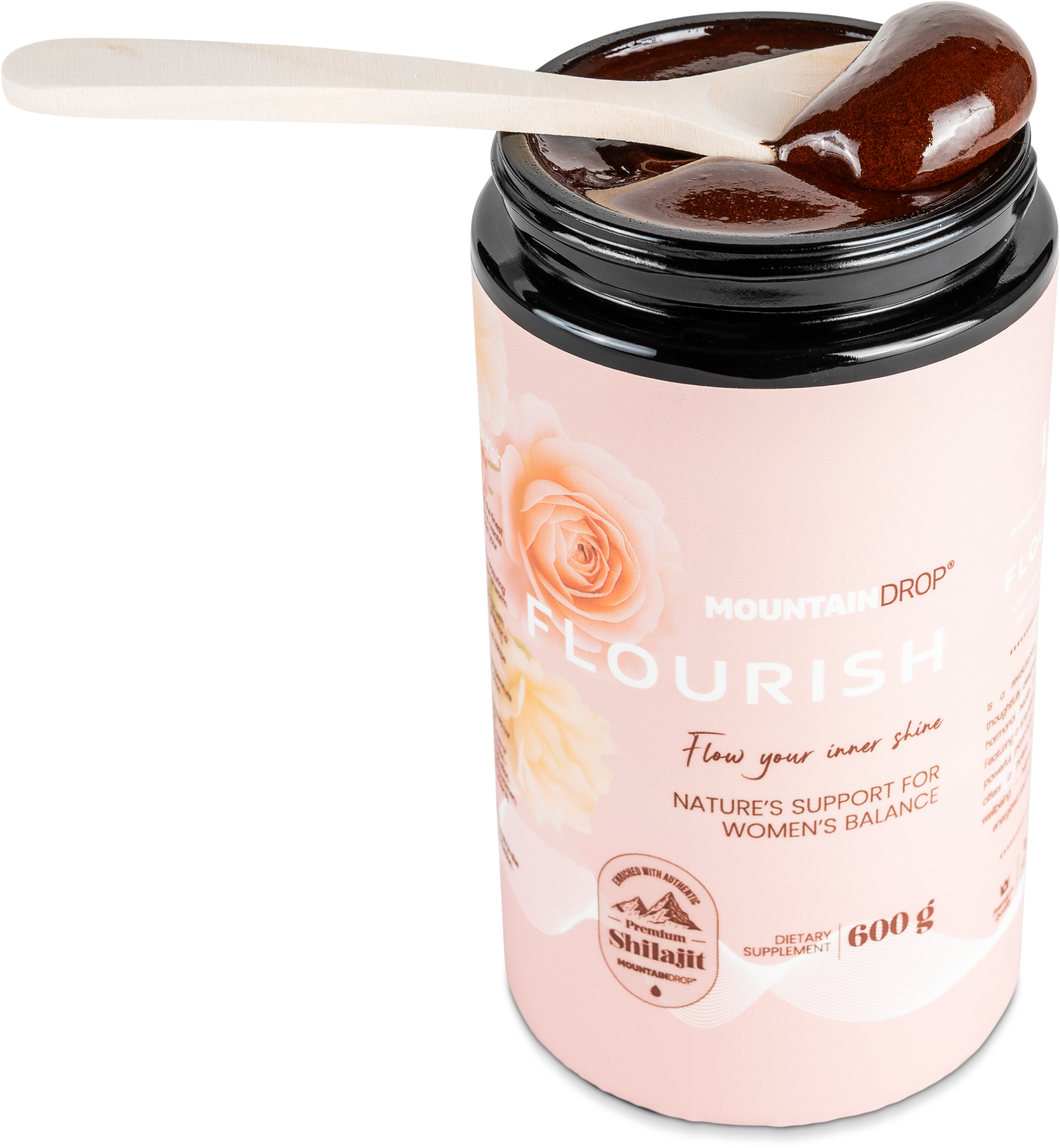 Flourish firmy Mountaindrop łączy najwyższej jakości shilajit z 13 specjalnie dobranymi składnikami w naturalnej bazie słoweńskiego miodu. Formuła opiera się na precyzyjnie zbilansowanej matrycy ashwagandhy KSM-66® i koreańskiego żeń-szenia, uzupełnionej tradycyjnie cenionymi ekstraktami ziołowymi, takimi jak shatavari, pieprz mnicha i czerwona koniczyna. Dopełnieniem mieszanki jest połączenie magnezu, cynku oraz witamin B6 i D3, które są harmonijnie osadzone w strukturze miodu. Delikatne przetwarzanie bez stresu termicznego zachowuje naturalne właściwości surowców w ich pierwotnej jakości.