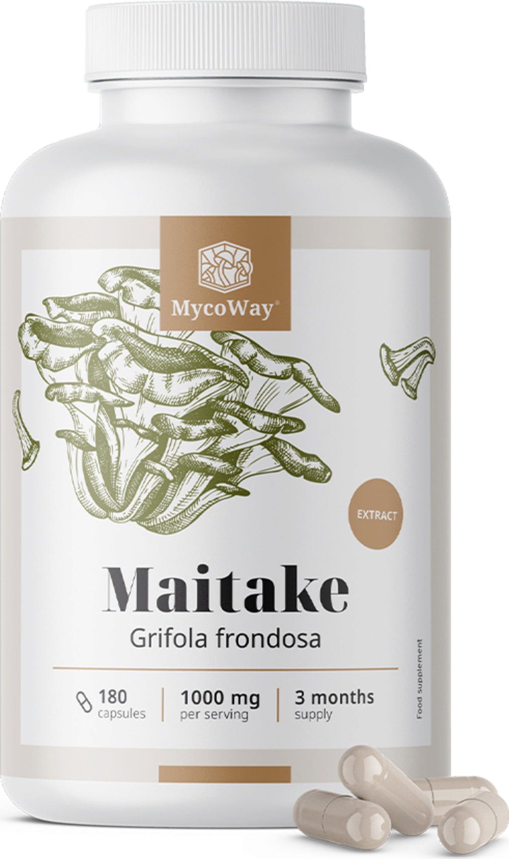 Kapsułki maitake od MycoWay zawierają skoncentrowany ekstrakt z tego grzyba. Każda dzienna dawka dostarcza określoną ilość ekstraktu z maitake w standaryzowanej formie. Poręczne kapsułki są łatwe do przyjmowania i można je elastycznie włączyć do rutyny - idealne dla każdego, kto chce wygodnie korzystać z naturalnych ekstraktów z grzybów.