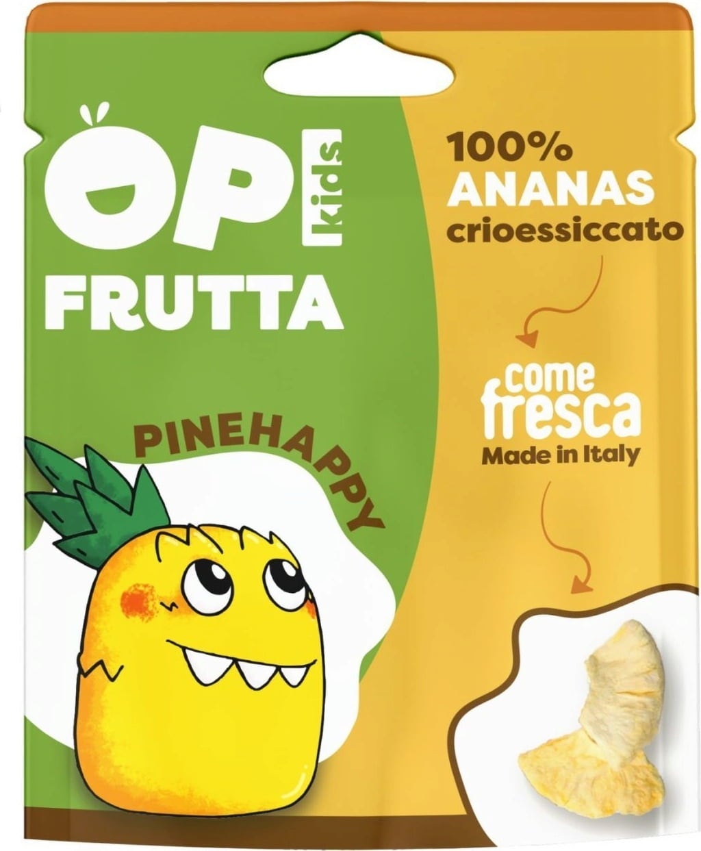 ANANAS OPI Kids to tropikalna słodycz ananasa w praktycznej, chrupiącej formie. Owoc jest liofilizowany wyjątkowo delikatnie, dzięki czemu zachowuje swój intensywny smak. Owocowa przekąska między posiłkami - w czystej postaci, w jogurcie lub w podróży.