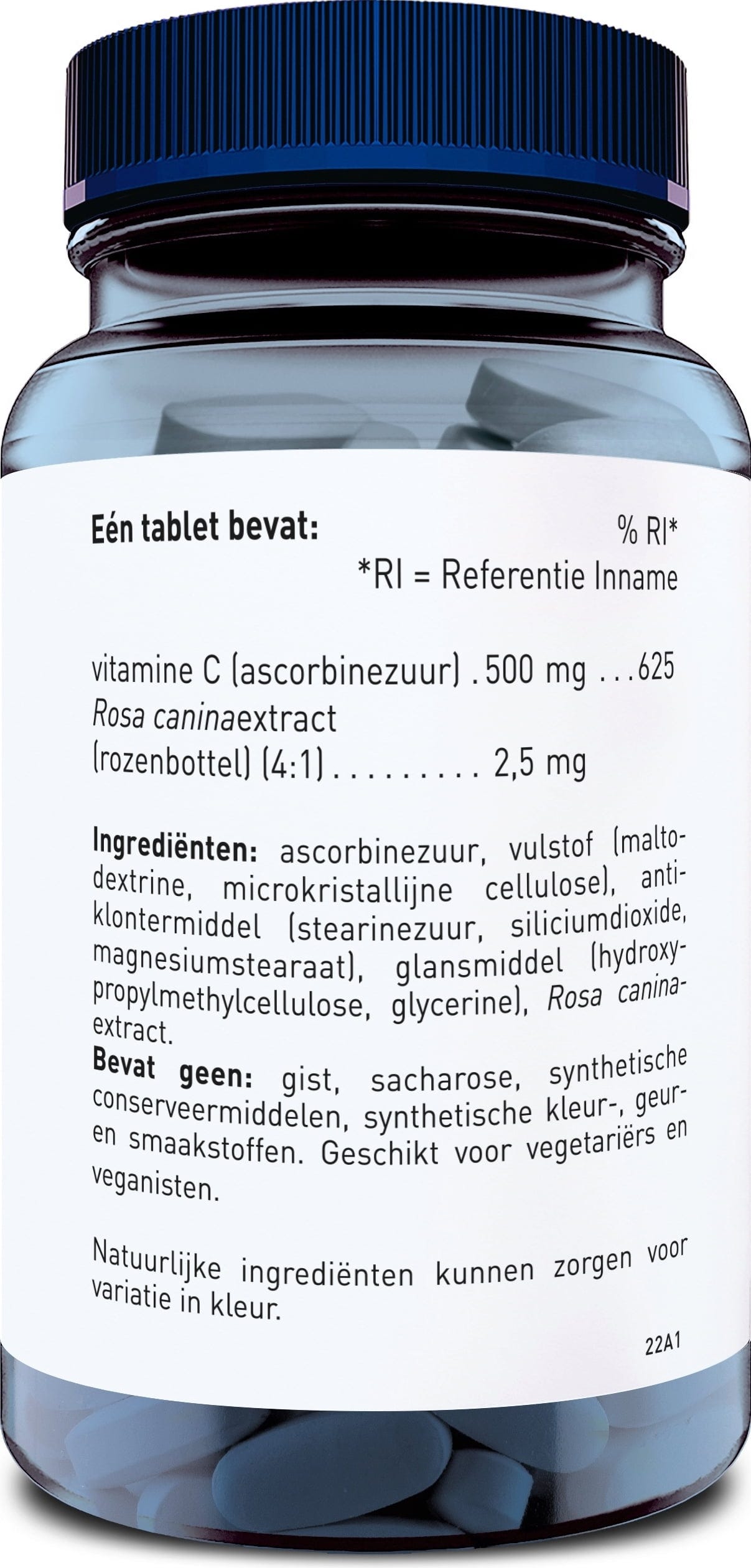 Kwas L-askorbinowy, Wypełniacz (maltodekstryna, celuloza mikrokrystaliczna), środek antyadhezyjny (kwasy tłuszczowe, ditlenek krzemu, sole magnezowe kwasów tłuszczowych), środki powlekające (hydroksypropylometyloceluloza, gliceryna), Ekstrakt z dzikiej róży