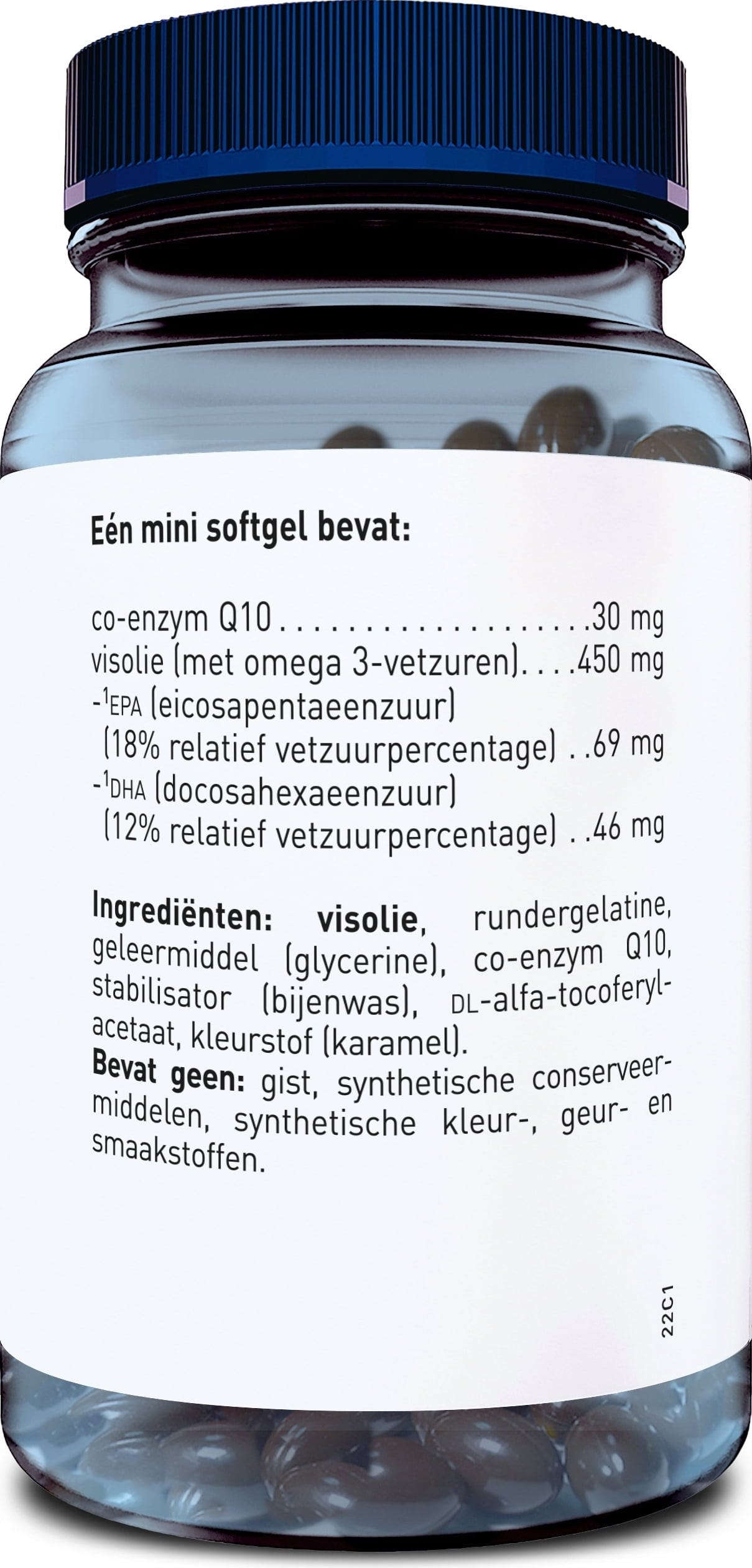 olej rybi (ryba), otoczka kapsułki (żelatyna wołowa), środek żelujący (gliceryna), koenzym q10, stabilizator (wosk pszczeli), D-Alpha-Tocopherylacetat, barwnik (karmel)