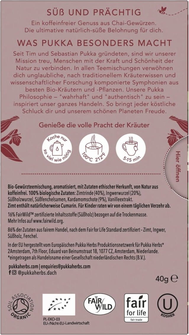 Przytul się w ciepłym uścisku ziół, które łączą słodycz z pikanterią! Bezkofeinowa mieszanka chai łączy kardamon i imbir z zachwycającym bogactwem cynamonu i wanilii. W ten sposób oferuje symfonię smaków, która uwiedzie Twoje zmysły.