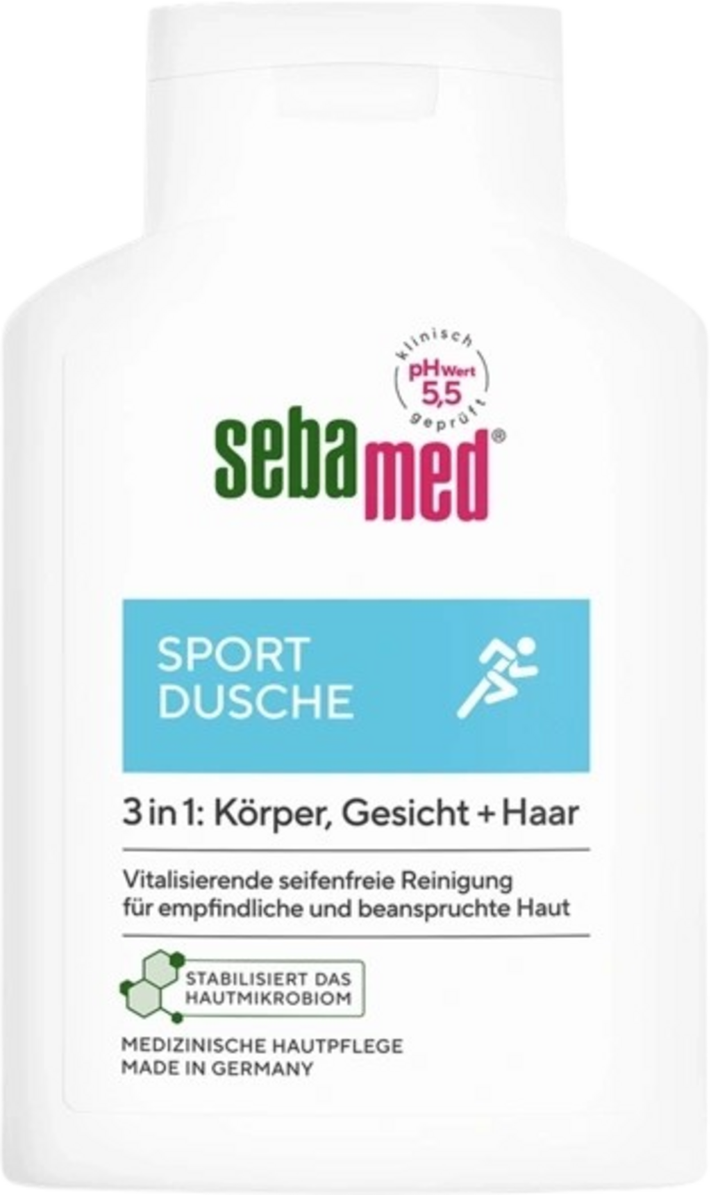 Pozbawiony mikroplastików żel pod prysznic sport 3 w 1 firmy sebamed niezawodnie i delikatnie oczyszcza wrażliwą i zniszczoną skórę ciała i twarzy, a także włosy po każdej sesji sportowej. Skóra jest natychmiast odświeżona i zrewitalizowana. Formuła ma wartość pH 5,5, dzięki czemu wspiera naturalną warstwę ochronną skóry.