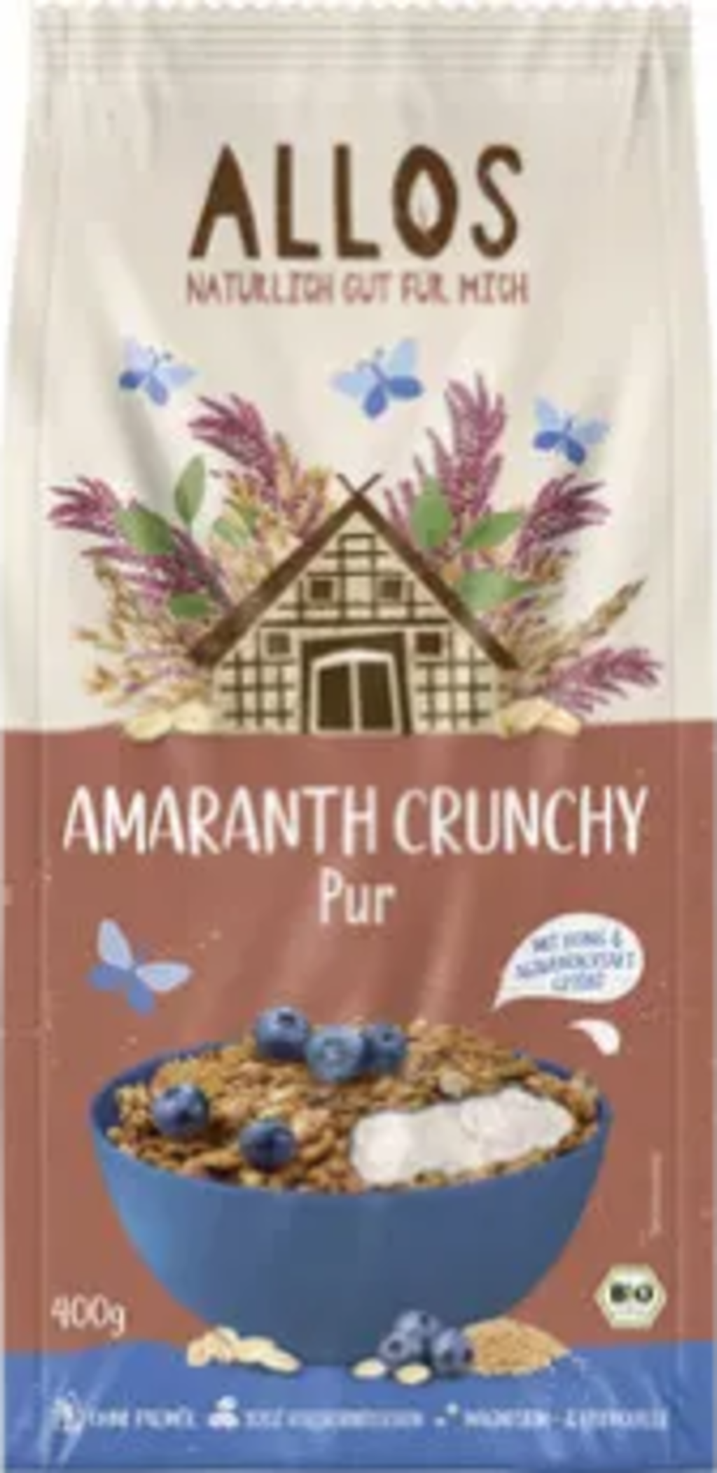 pełnoziarniste płatki owsiane[1], 11 % amarantusowe płatki kukurydziane[1], kukurydza[1], 28 % amarantus pełnoziarnisty[1], 5 % miód[1], Glukosesirup[1], 9 % syrop z agawy[1], syrop ryżowy[1], 6 % całe ziarna amarantusa wyłuskane i zmielone[1], chrupki ryżowe[1], ryż[1], skrobia ziemniaczana[1], olej słonecznikowy[1], siemię lniane[1], razowa mąka orkiszowa (rodzaj pszenicy)[1], sezam[1], sól morska, przeciwutleniacz (ekstrakty zawierające silne tokoferole)