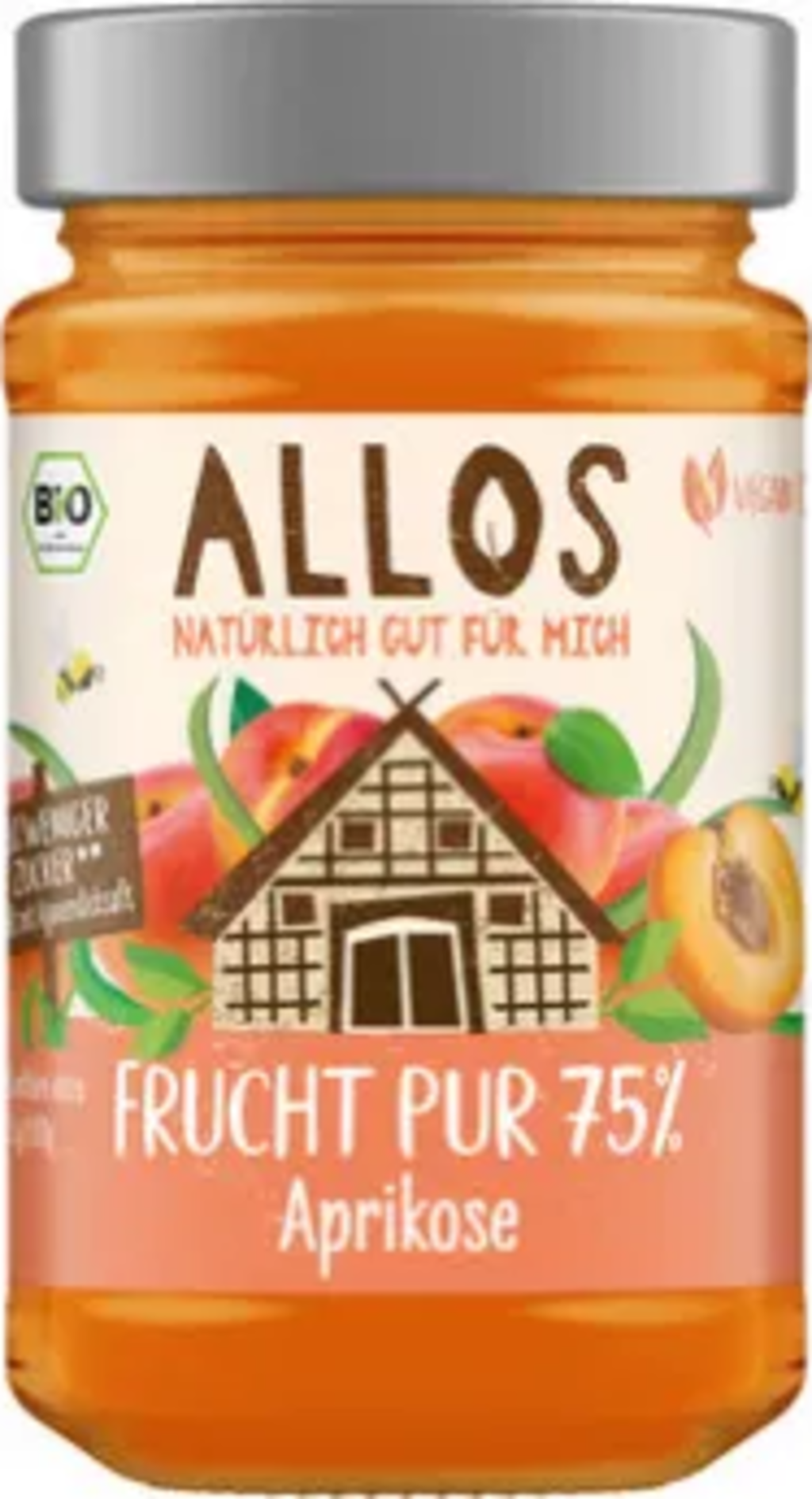 Czysty owocowy smak chleba śniadaniowego: ALLOS umożliwia to teraz dzięki dżemowi organicznemu czyste owoce 75%. Dojrzewające w słońcu morele są delikatnie przetwarzane na tę odmianę i dopełniane słodyczą syropu z agawy. Wegańskie i z 58% mniejszą zawartością cukru.