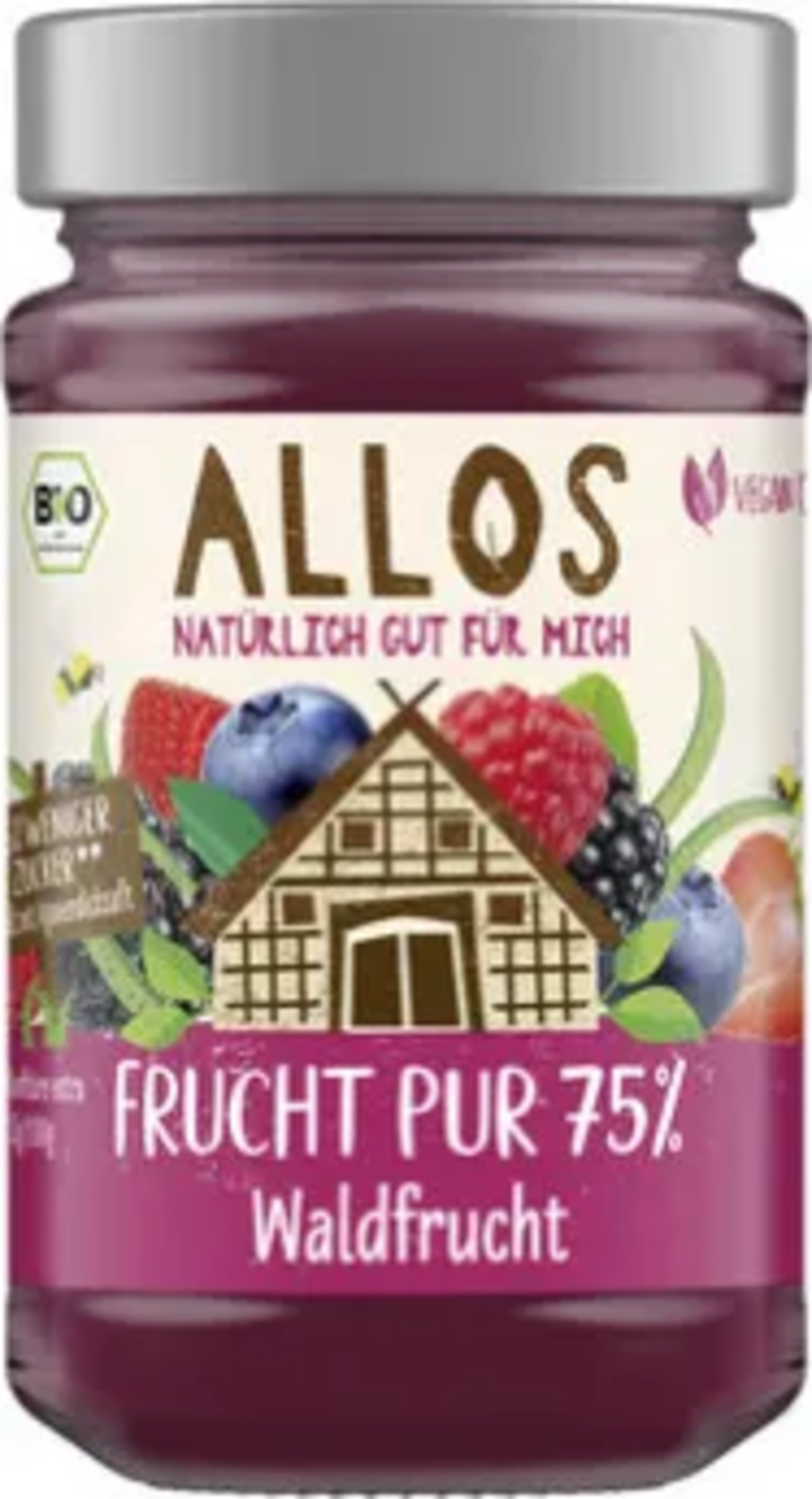 Czysty owocowy smak chleba śniadaniowego: ALLOS tumożliwia to teraz dzięki dżemowi organicznemu czyste owoce 75%. W przypadku tej odmiany typowe owoce leśne, takie jak jeżyny, truskawki, maliny, tarniny, jagody i czarne jagody, są delikatnie przetwarzane i dopełniane słodyczą syropu z agawy. Wegańskie i zawierające 56% mniej cukru.
