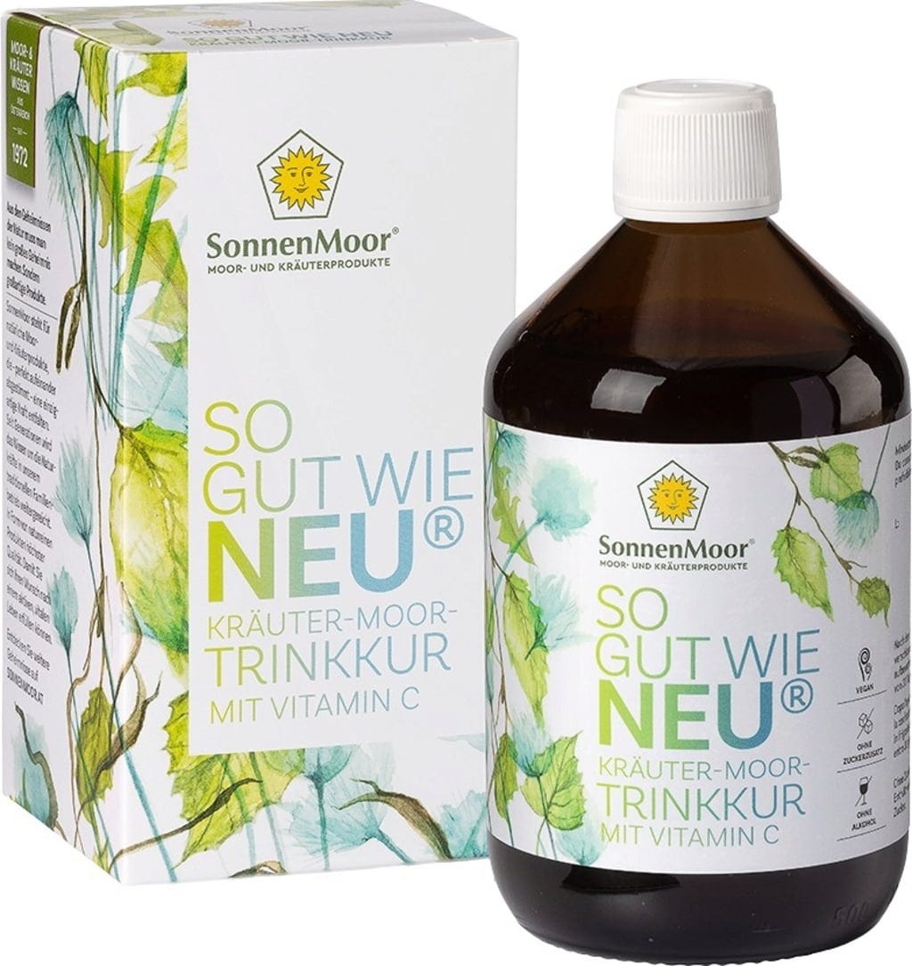 Ziołowy sok z torfem 'So gut wie Neu' to intensywny ekstrakt ziołowy austriackiej firmy rodzinnej SonnenMoor. Formuła łączy właściwości 15 różnych ekstraktów roślinnych, takich jak korzeń mniszka lekarskiego, liście brzozy, pokrzywa i dziki czosnek z naturalnymi składnikami torfu. Ta płynna mieszanka jest uzupełniona proszkiem aceroli, który służy jako naturalne źródło witaminy C. Witamina C pomaga chronić komórki przed stresem oksydacyjnym i wspiera prawidłowy metabolizm energetyczny.