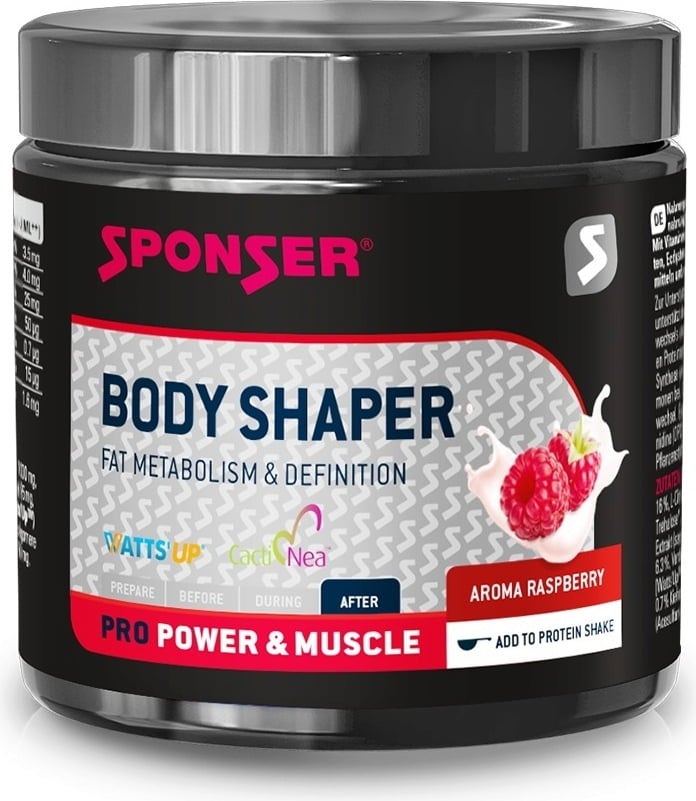 Body Shaper firmy Sponser Sport Food jest idealnym uzupełnieniem faz wzmacniania mięśni i diety w treningu siłowym. Formuła jest czysto roślinna i opiera się na czystych fitosubstancjach, tj. OPC, flawonoidy cytrusowe, betaina i ekdysteron. Shake ma również bardzo łagodny smak, ponieważ dodaje się do shake'a proteinowego. Mimo wszystko smakuje owocowo jak maliny i dopełnia smak wieloma substancjami roślinnymi.