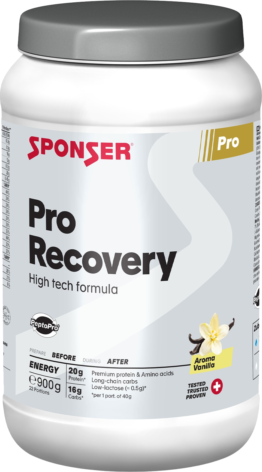 Proszek Pro Recovery firmy Sponser, który składa się w całości z izolatu białka serwatki, idealnie nadaje się do dziennego spożycia białka. Napój dla sportowców o smaku wanilii, nie zawiera laktozy i ma wysoką zawartość białka wynoszącą 94% w suchej masie. Dodatkowo proszek waniliowy został uzupełniony wysoką zawartością BCAA wynoszącą 25%.