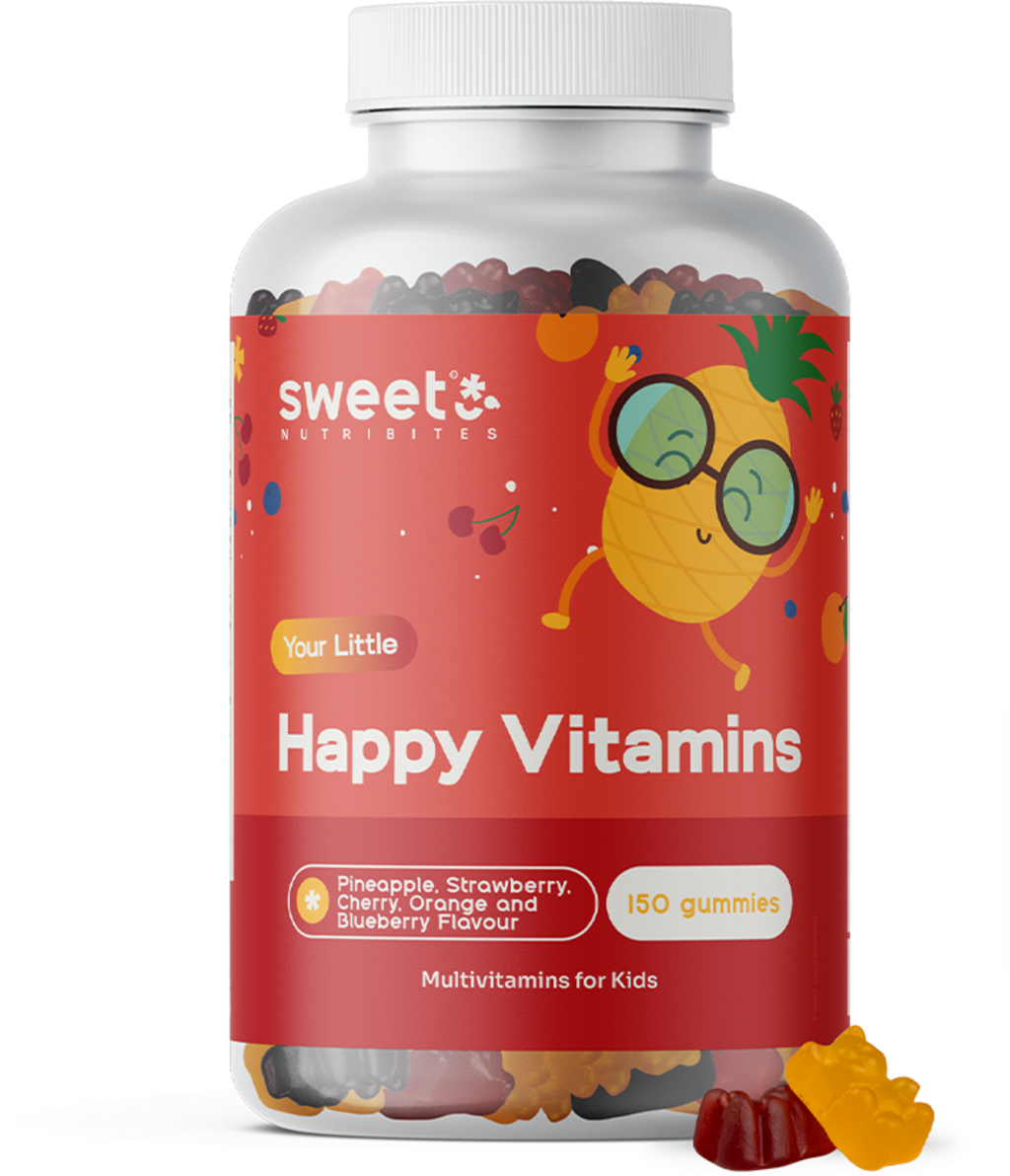 Happy Vitamins od Sweet Nutribites zawierają szeroką gamę mikroskładników odżywczych, które są idealnie dostosowane do potrzeb dzieci w wieku 3 lat i starszych.