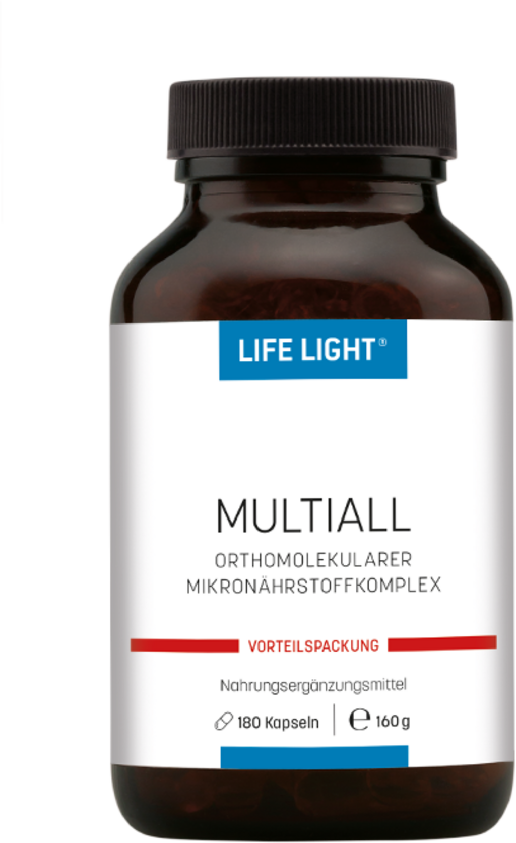 Charakterystyczną cechą Life Light® MultiAll jest nowo wynaleziona formuła " all in one - wszystko w jednym", dla sensownego zaopatrzenia organizmu w witaminy, pierwiastki śladowe i minerały, jako suplement codziennego odżywiania.Dodatkowa zaleta to zawartość tzw. witaminoidów, roślinnych enzymów , jak i bioaktywnych składników roślinnych.