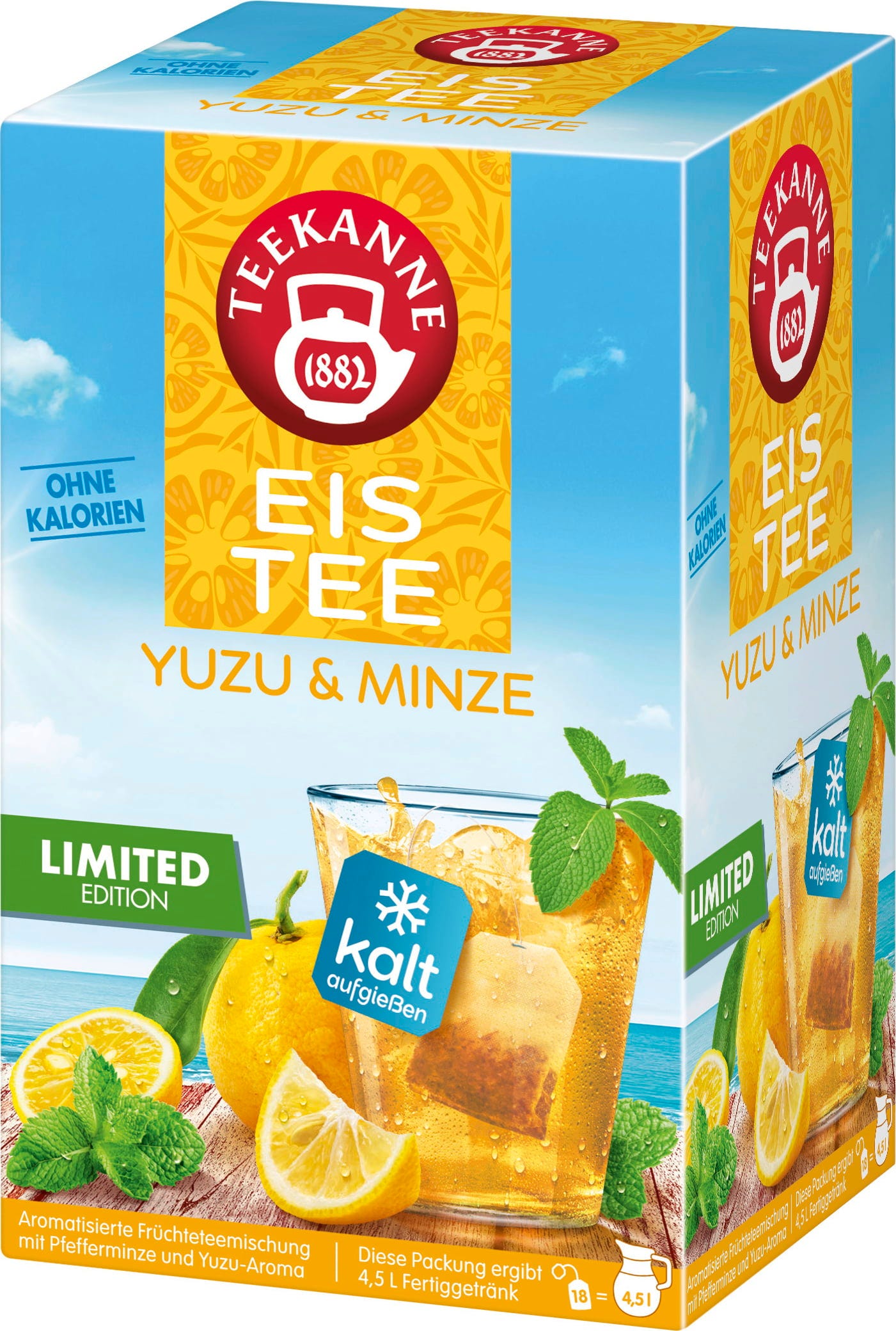 Odśwież się w gorące letnie dni dzięki mrożonej herbacie yuzu & mint od Teekanne. Torebki herbaty są idealne do zalewania zimną wodą i oferują pyszny sposób na ochłodę w domu lub w podróży.