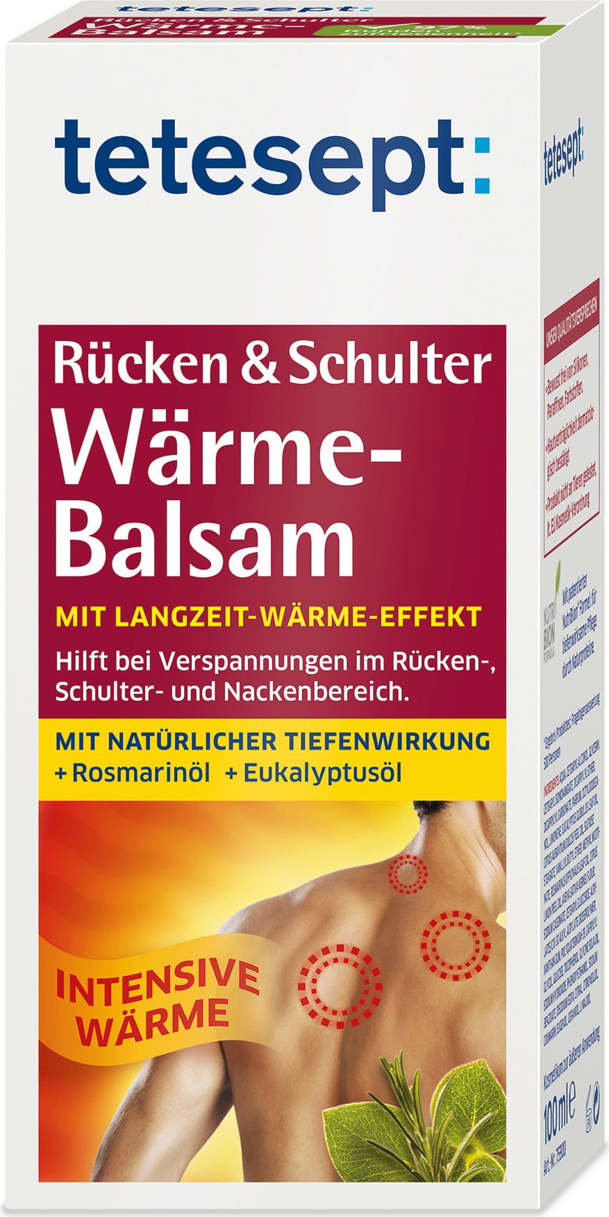 Balsam rozgrzewający tetesept zapewnia długotrwały efekt rozgrzewający na plecach, ramionach i szyi! Balsam szybko się wchłania i jest nietłusty, a dzięki formule Nutri-Bion® substancje odżywcze są szczególnie dobrze wchłaniane przez skórę. Naturalne olejki eteryczne z rozmarynu, eukaliptusa i cytryny doskonale uzupełniają produkt!
