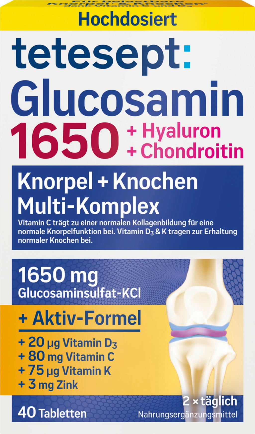 Tabletki Glukozamina 1650 firmy tetesept zawierają również hialuron, chondroitynę, cynk oraz witaminy D3, C i K.