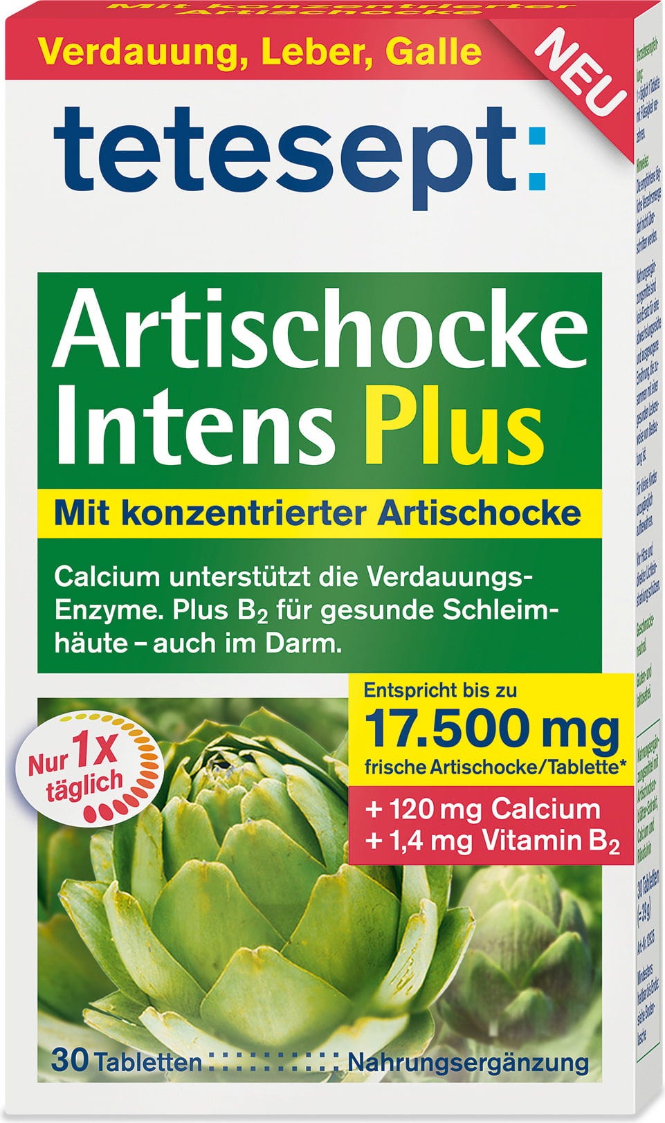 Tabletki Artichoke Intens Plus firmy tetesept zawierają ekstrakt z liści karczocha oraz wapń i witaminę B2. Wystarczy jedna tabletka dziennie, aby optymalnie wspomóc organizm. Formuła nie zawiera glutenu i laktozy.