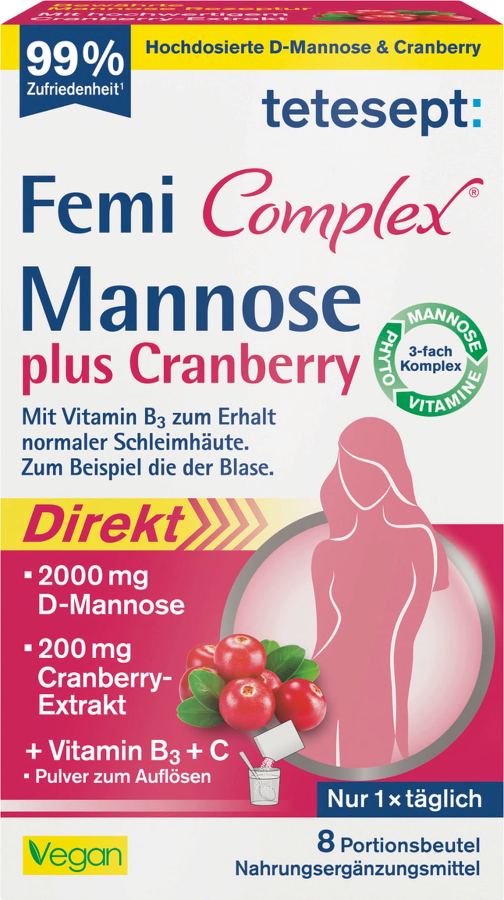 Wegański Femi Kompleks od tetesept zawiera D-mannozę, ekstrakt z żurawiny oraz witaminy C i B3. D-mannoza to naturalny cukier prosty, który od wielu lat jest popularnym suplementem diety. Ten cukier prosty może być również wytwarzany przez sam organizm w niewielkich ilościach, ale w razie potrzeby dodatkowe spożycie może mieć sens. Dzięki praktycznym saszetkom jest szczególnie łatwy do przyjęcia.