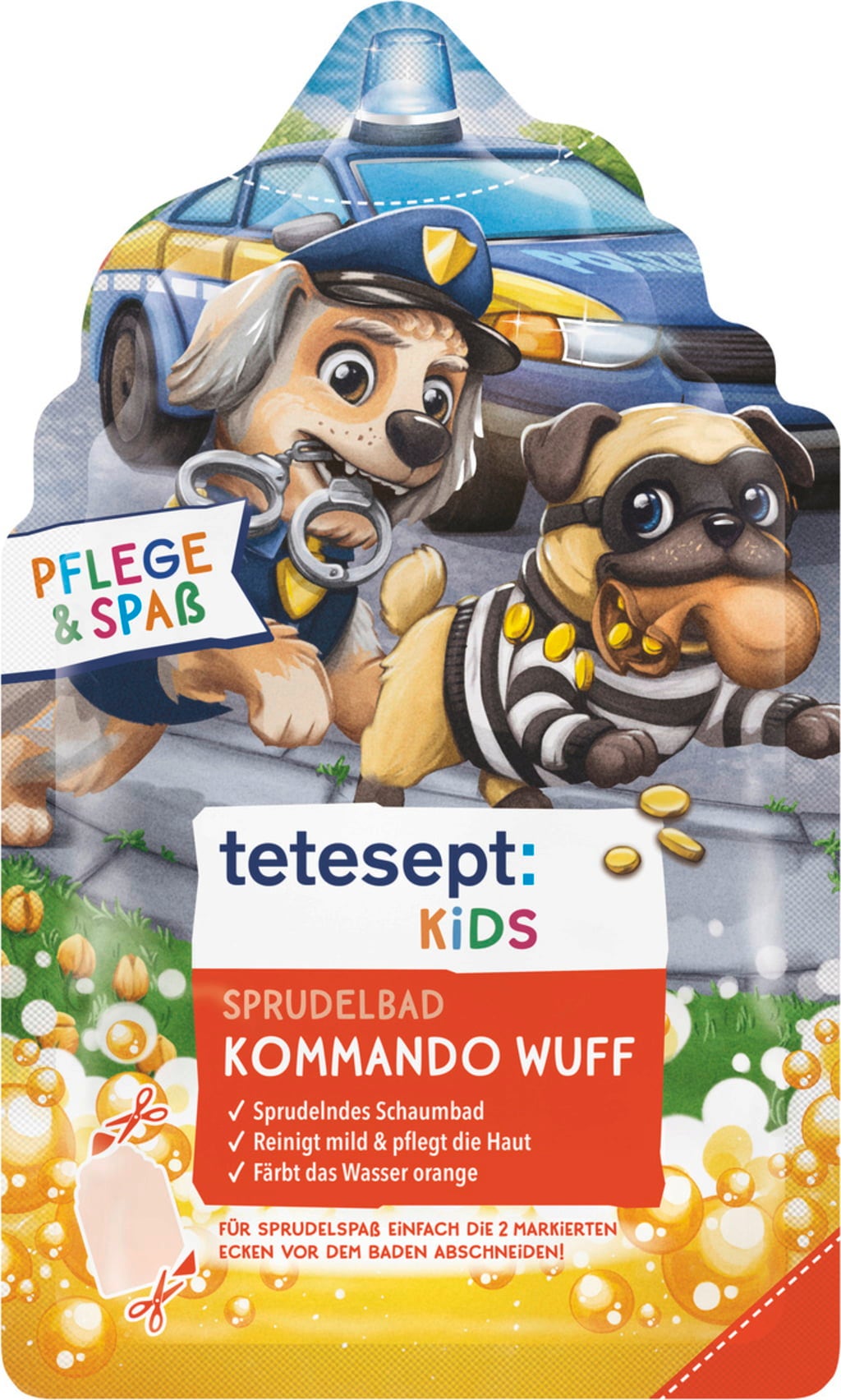 Płyn do kąpieli dla dzieci Kommando Wuff od tetesept zapewnia emocje i zabawę w wannie. Barwnik spożywczy zabarwia wodę na pomarańczowo, a owocowy zapach orzeźwia zmysły. Masło kakaowe delikatnie pielęgnuje skórę dziecka. Płyn do kąpieli jest odpowiedni dla dzieci w wieku od 3 lat.