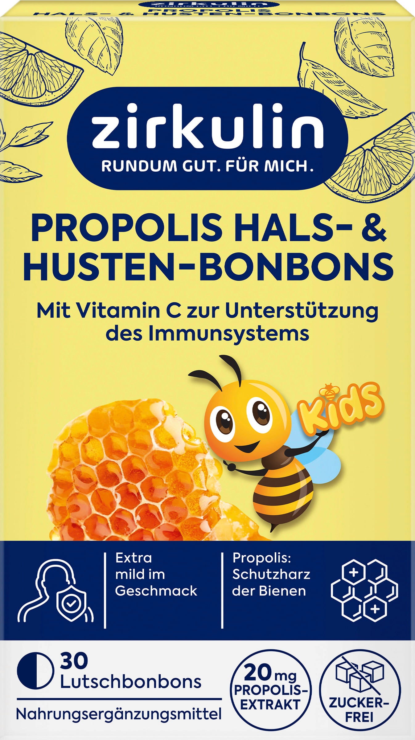 Cukierki na gardło Kids Propolis od zirkulin smakują wyjątkowo łagodnie dzięki miodowo-pomarańczowemu smakowi i mogą być przyjmowane przez dzieci w wieku od 4 lat. Cukierki są produkowane bez dodatku cukru i zawierają cenną witaminę C.